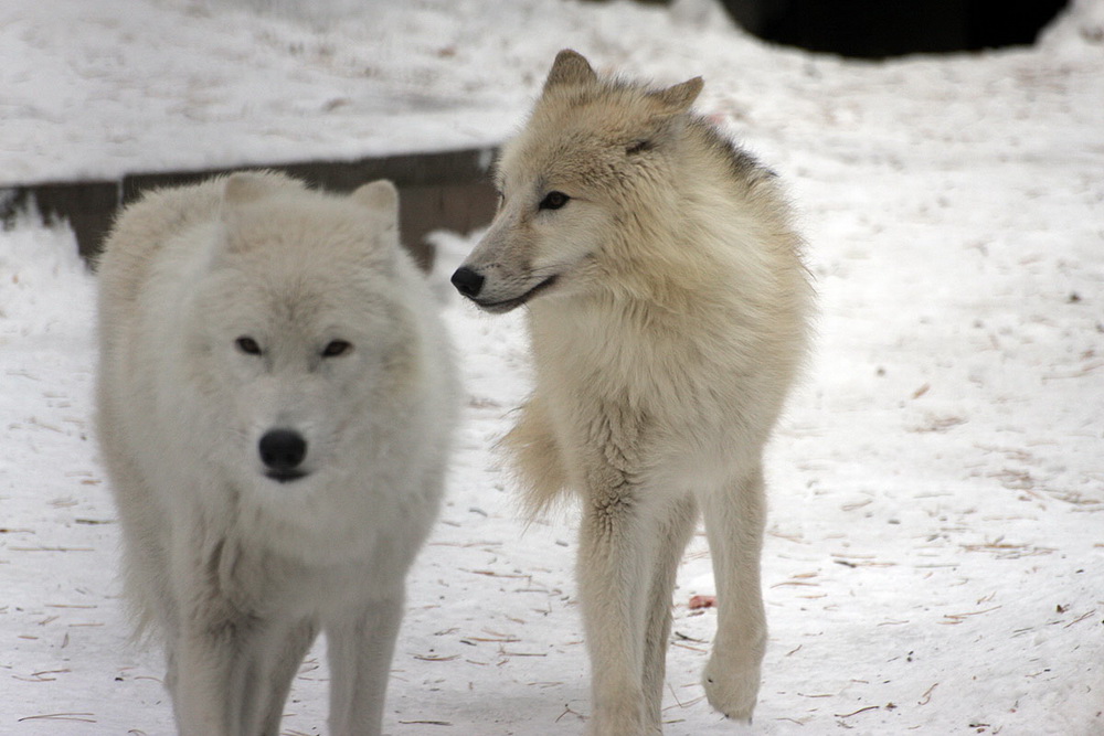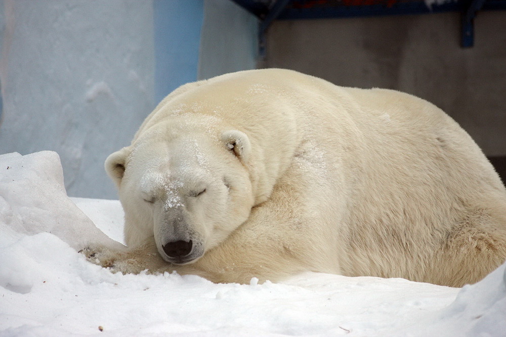 А вот белые медведи, наоборот, любят холод и снег. Зима — их время. Кай и Герда с удовольствием и подолгу гуляют, могут выходить из своих укрытий даже по ночам. Кай частенько устраивается спать прямо на улице — видно, что он совсем не мёрзнет.