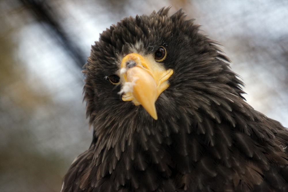 Хищные птицы остаются на своём уличном посту даже зимой. Зорко следят за каждым прохожим. В вольерах у каждой есть место, где можно спрятаться от ветра или удобно устроиться со своей едой-добычей.