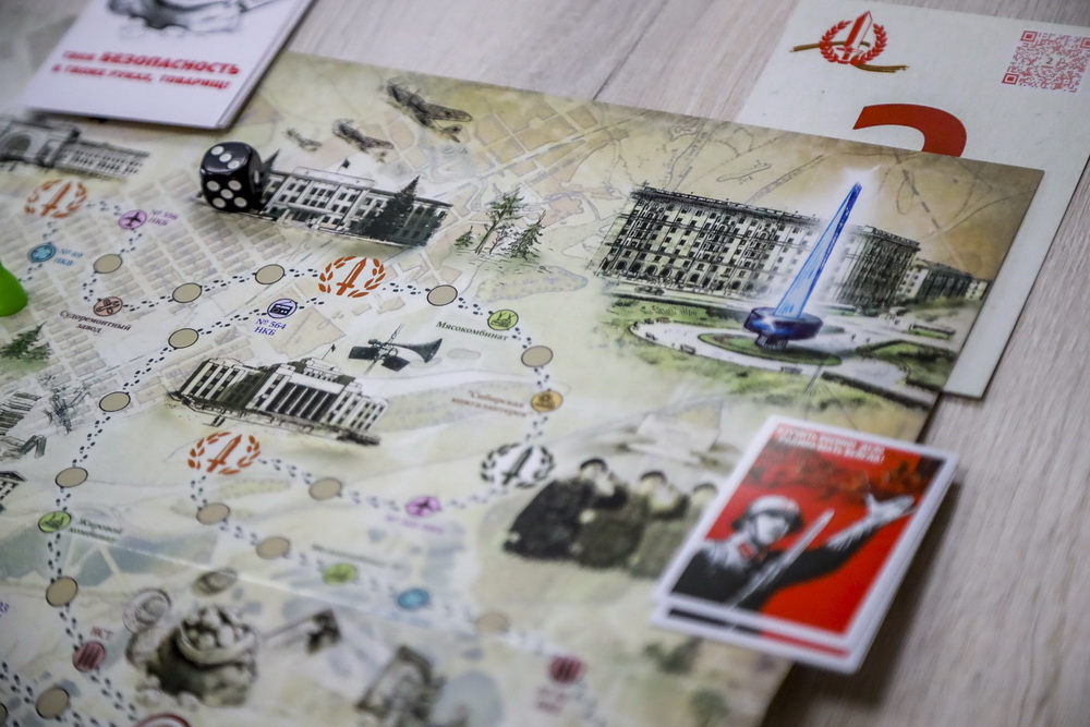 Игроки бросают кубики и передвигаются по полю, на которое нанесены заводы, работавшие для фронта, и другие значимые объекты: вокзал, дом офицеров, оперный театр.