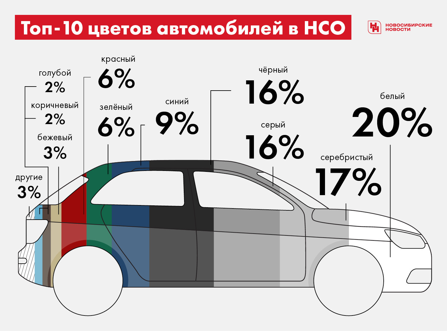 «На втором месте по востребованности в Новосибирской области оказались автомобили серебряного цвета, на третьем — серого, на четвёртом — чёрного, а на пятом — синего», — рассказали авторы исследования.