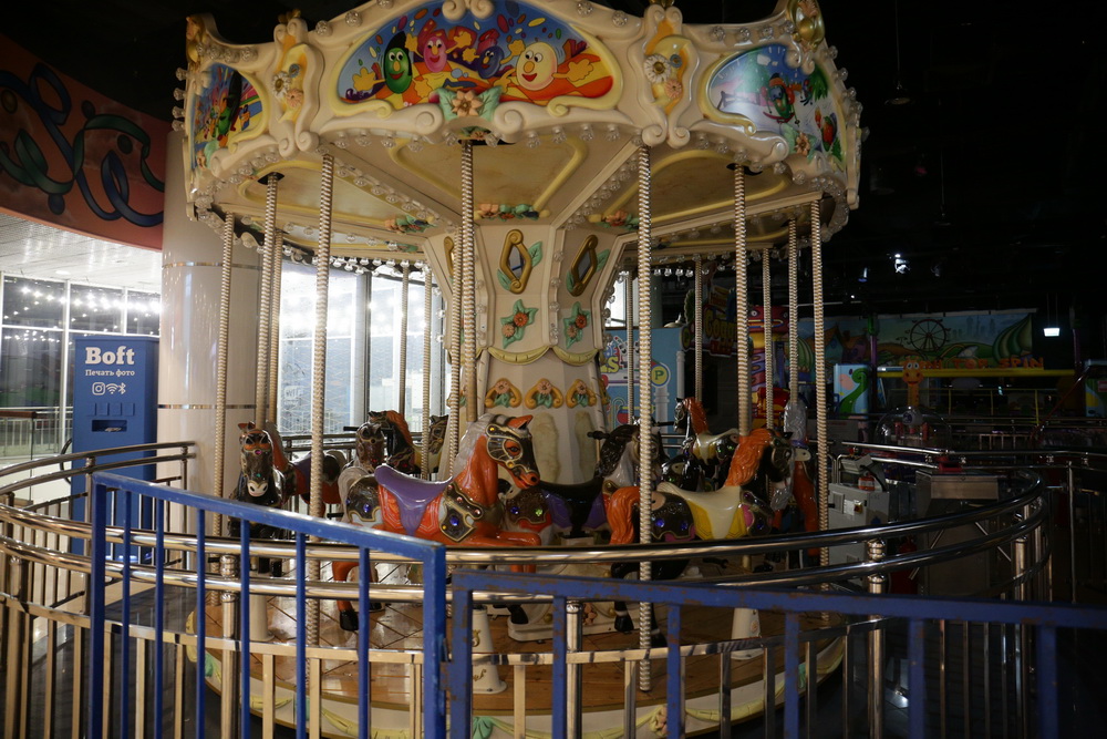 В период повышенной готовности в торговых центрах не так многолюдно, как обычно. Вот и сейчас аттракционы закрыты, на фуд-корте практически никого нет. Нет столов, стульев, точки общепита работают только навынос.