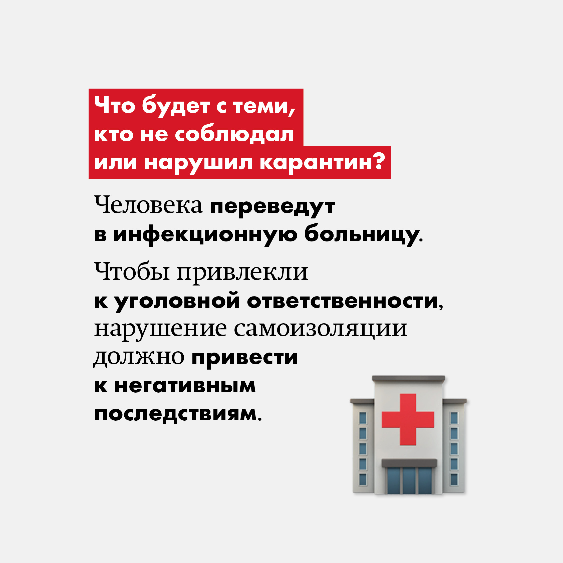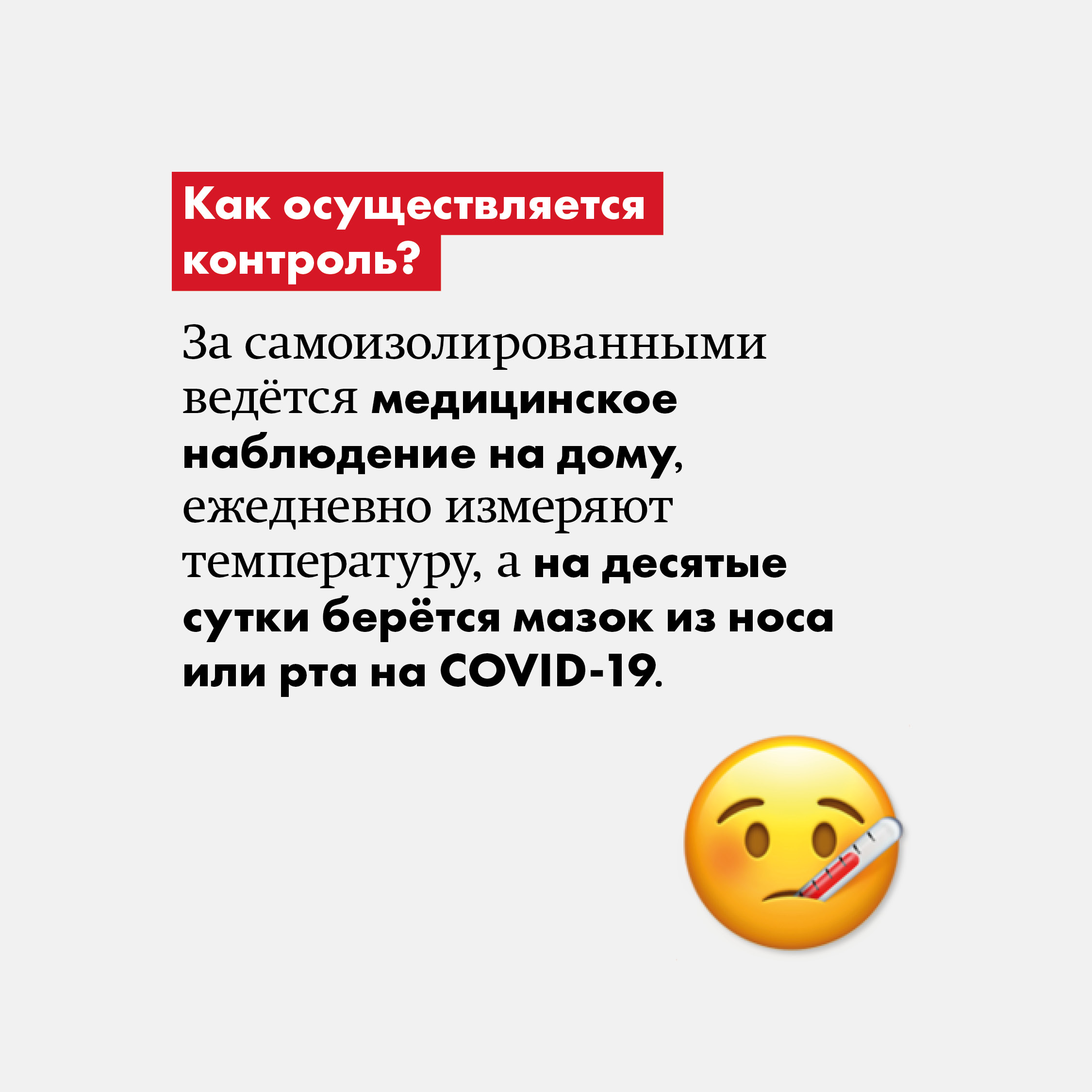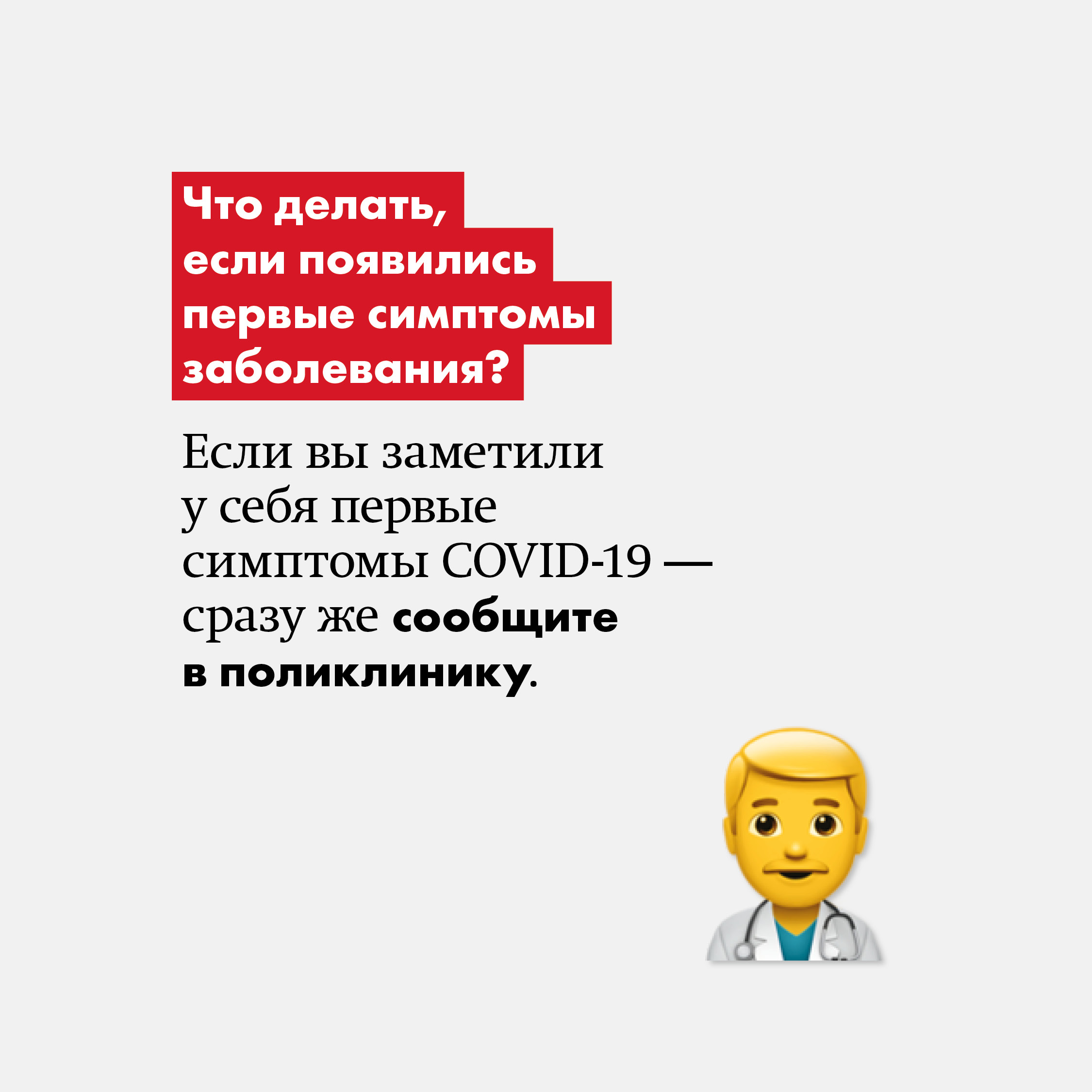 Ежедневно необходимо измерять температуру и следовать всем рекомендациям врачей. На десятые сутки делают тест на COVID-19. При появлении первых симптомов ОРВИ нужно немедленно, не покидая квартиру, сообщить об этом своему врачу, а затем вызвать скорую помощь — для перевода в инфекционную больницу.