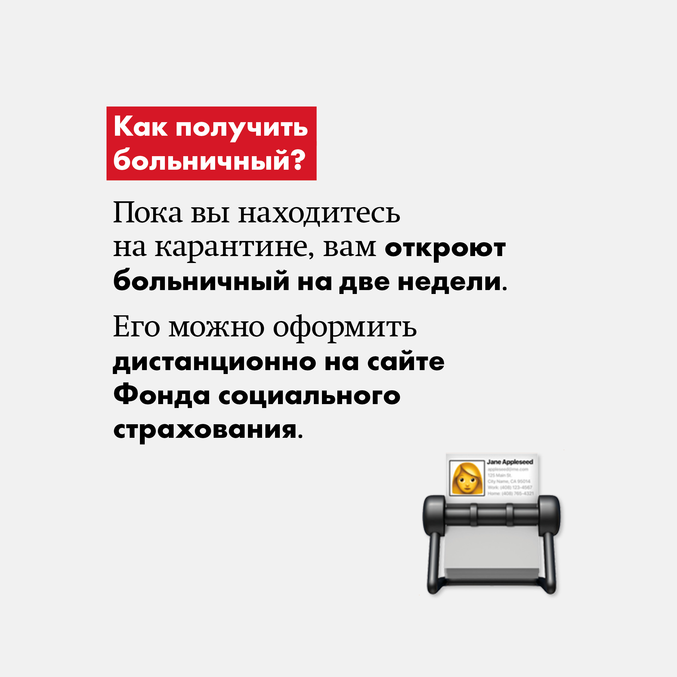 На весь период самоизоляции выдают больничный. Чтобы его получить, не нужно посещать поликлинику. Медицинские работники помогут оформить его на дому. Также можно подать заявление на дистанционное оформление больничного самостоятельно на сайте фонда социального страхования.