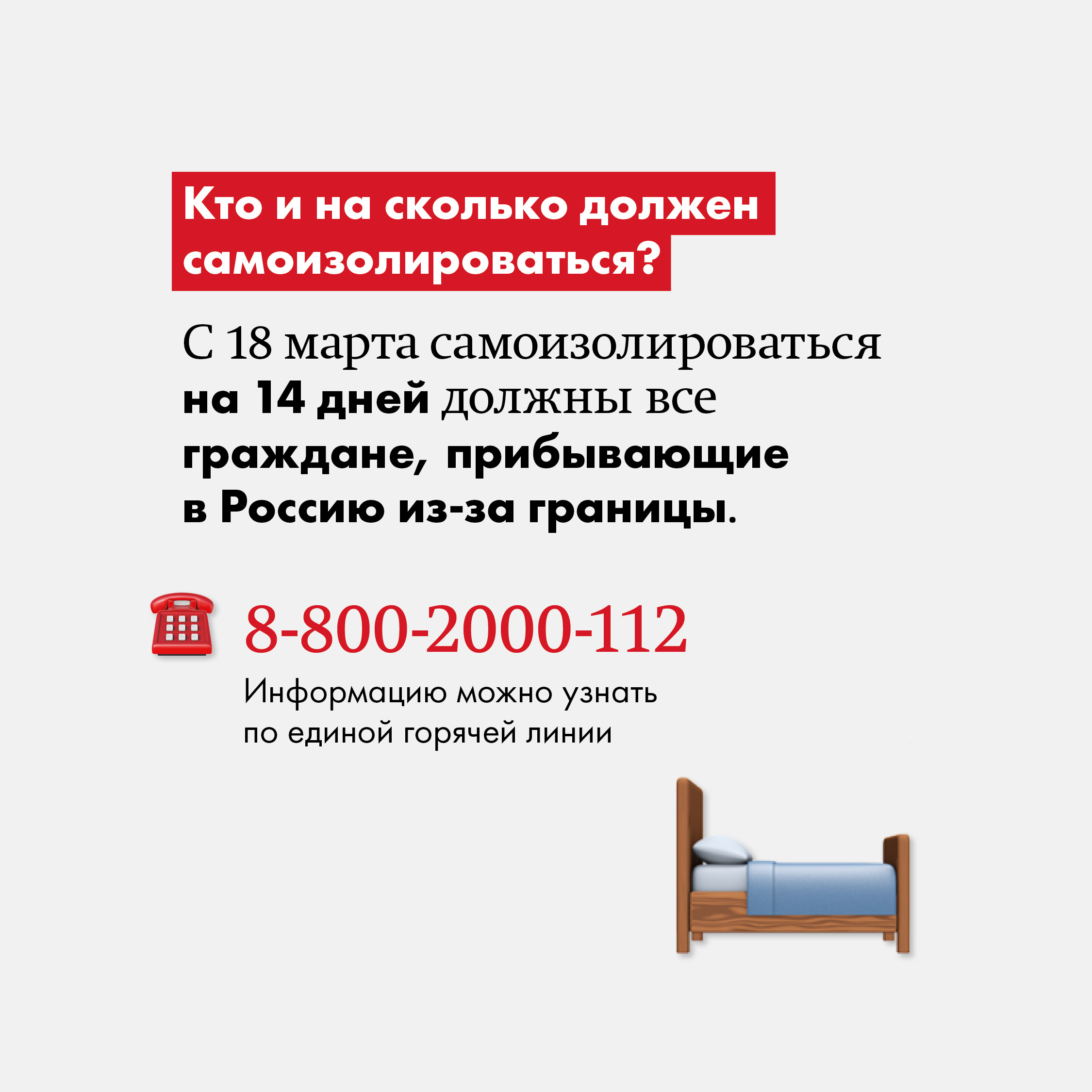 Самоизоляция длится 14 дней с момента приезда в Россию. В аэропорту прилёта каждый, кто пересекает границу, получает постановление о самоизоляции. Если этого по какой-то причине не произошло, в Новосибирске необходимо сообщить о себе на «горячую линию» по телефону 112: оставить адрес, телефон, информацию о том, откуда и когда приехал. Эти данные передадут в поликлинику, чтобы установить медицинское наблюдение.