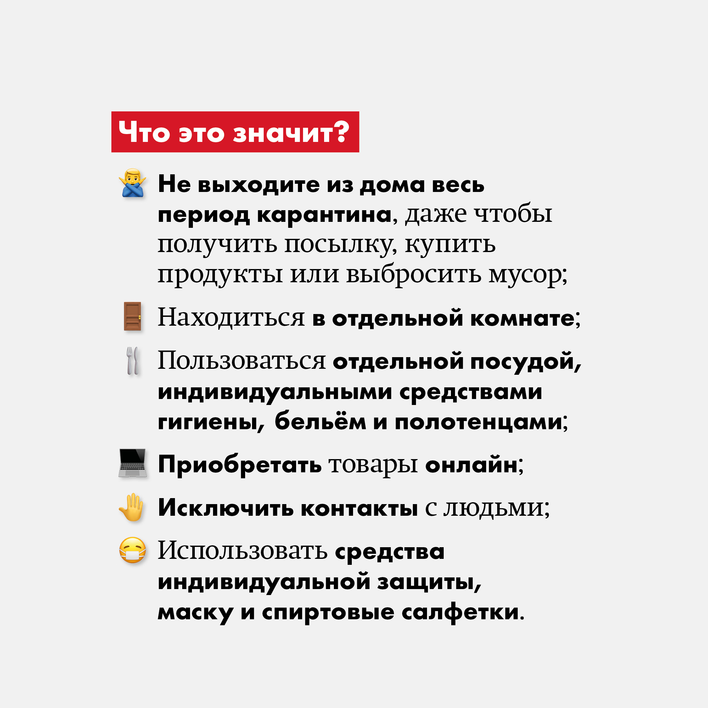 Выходить из квартиры, даже ненадолго, запрещено. Нельзя самостоятельно покупать продукты или лекарства, выносить мусор. Человеку, находящемуся в изоляции, должны помогать родственники, волонтёры без личного контакта. Также он может пользоваться услугами службы доставки. Продукты и предметы ему должны оставлять у входа в квартиру, оплачивать их следует с помощью безналичного расчёта.