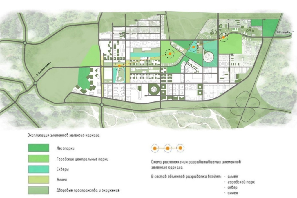 Этот проект в своей дипломной работе создала студентка кафедры дизайна архитектурной среды Александра Пищалова. Она разработала непрерывный зелёный экокаркас и его элементы, такие как парки, скверы, аллеи.