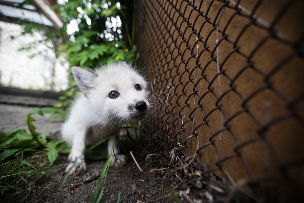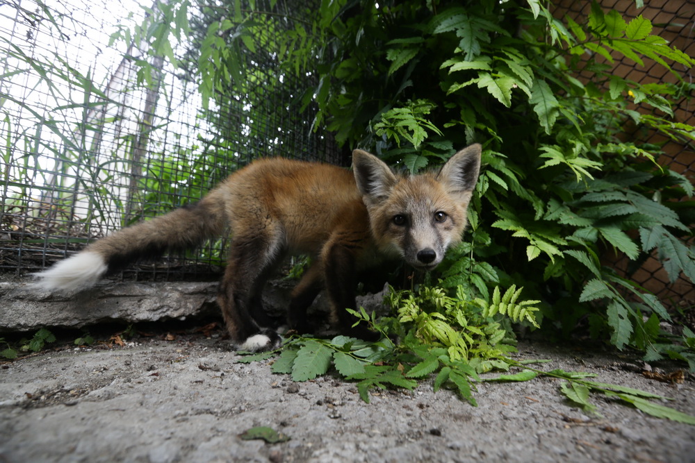 Лисёнку примерно два месяца, он родился весной. Его содержат не в клетке, а в большом вольере. Зверь учится жить с человеком, в будущем его отдадут любящим хозяевам.