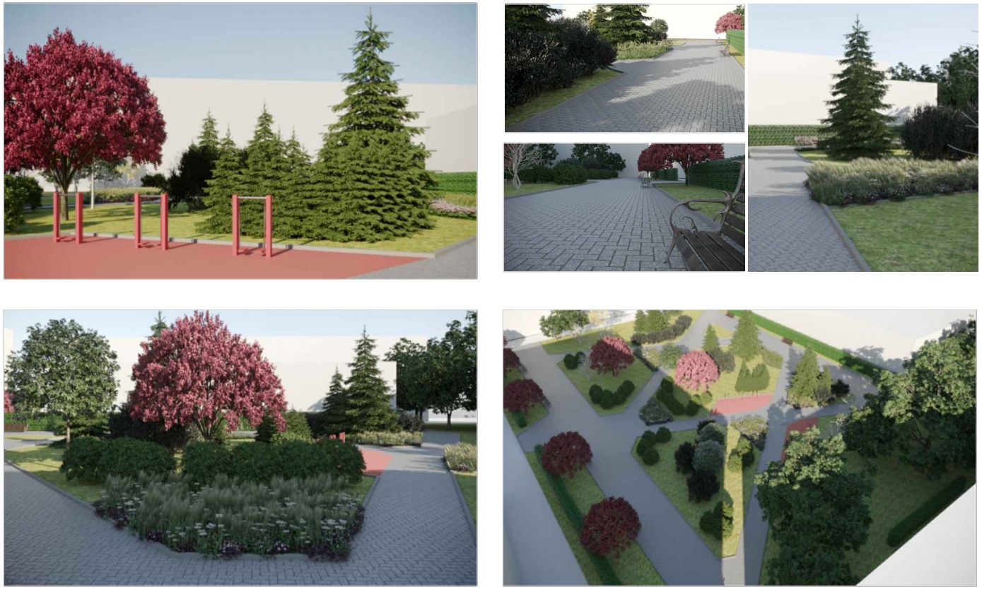 На мощённых брусчаткой дорожках установят новые скамейки. Кроме того, по периметру сквера появится живая изгородь из кустарников, а в центре — клумбы с цветущими растениями.