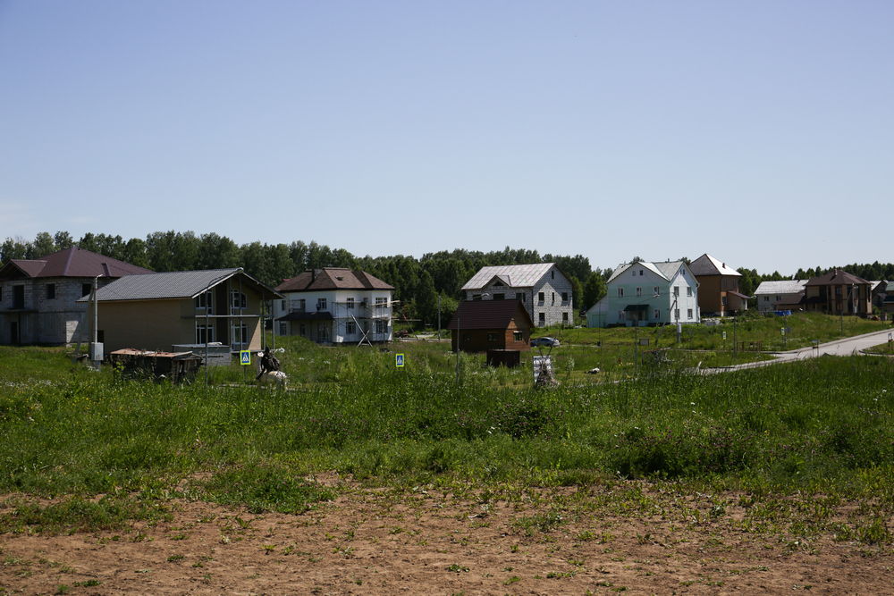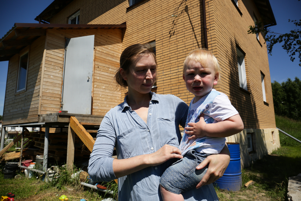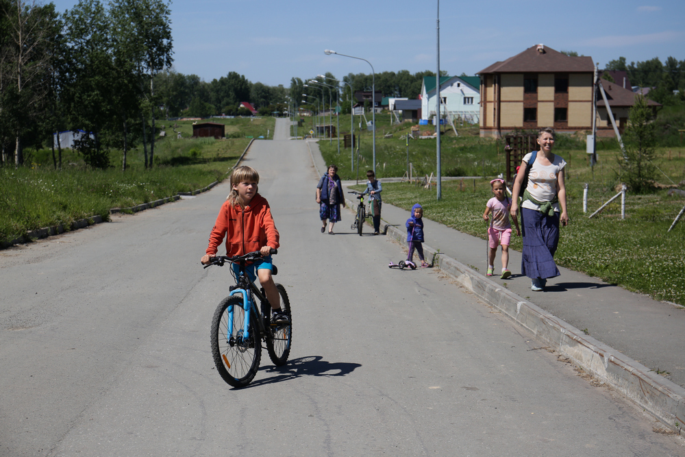 Дарья Оболенская, мама пятерых детей: «Мы здесь живём третий год. Купили недостроенный дом. Землю нам, к сожалению, так и не дали. С 2011 года мы стоим на очереди. Очередь двигается, но очень медленно. Сейчас в посёлке около 300 детей. Основная часть жителей — это многодетные семьи. И это здесь очень чувствуется. Когда в это сообщество попадаешь, то ощущаешь особенную атмосферу. Мы так рады, что попали сюда, потому что мы нашли своих и успокоились. А это главная задача в жизни. Когда мы жили в хрущёвке, мы там всем мешали — велосипеды, самокаты, коляски, шум, дети туда-сюда бегают. А здесь мы вырвались на вольную волю».