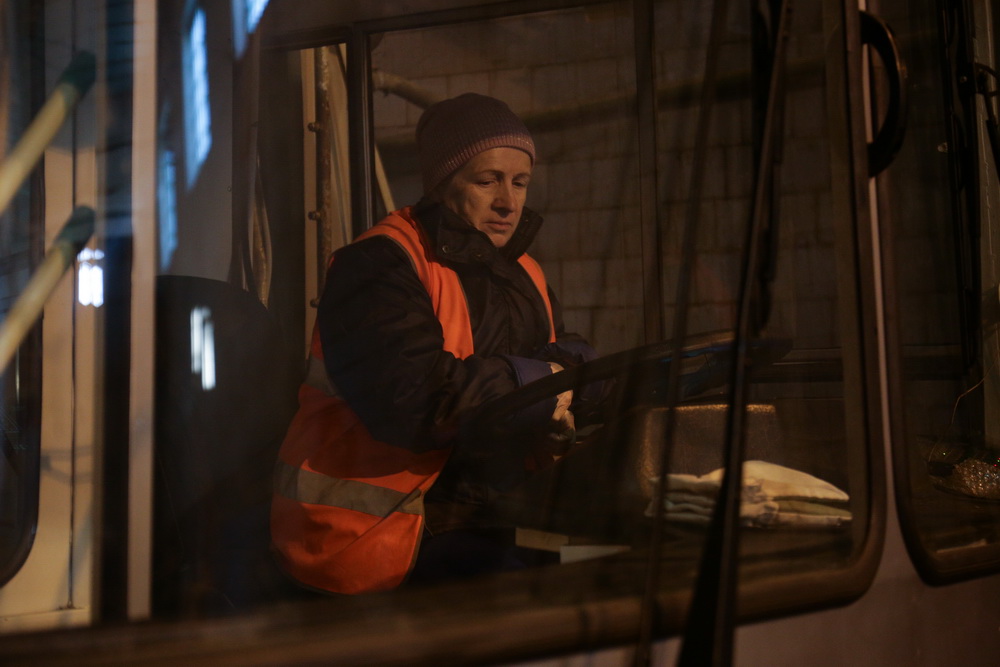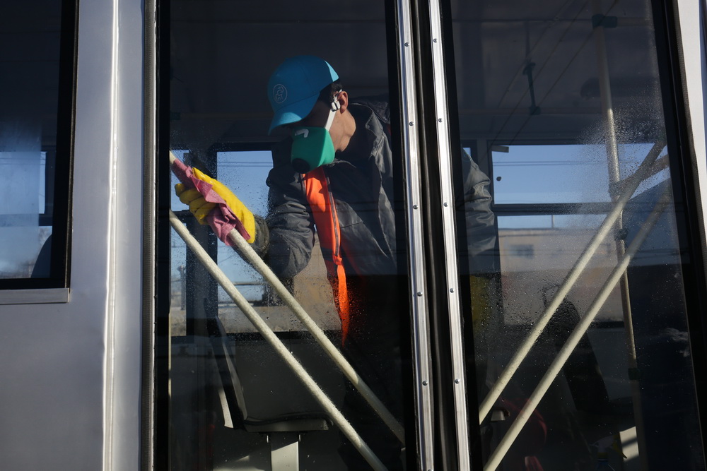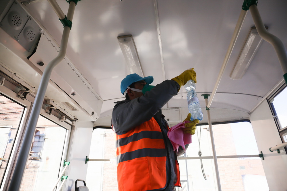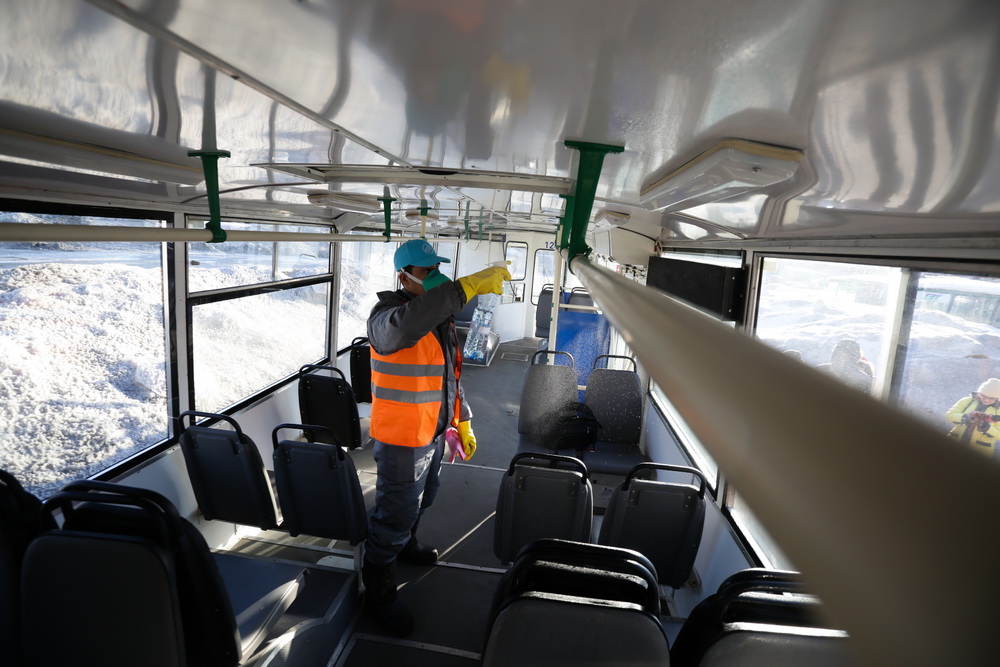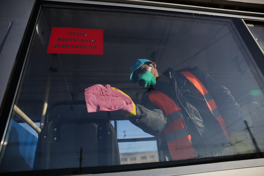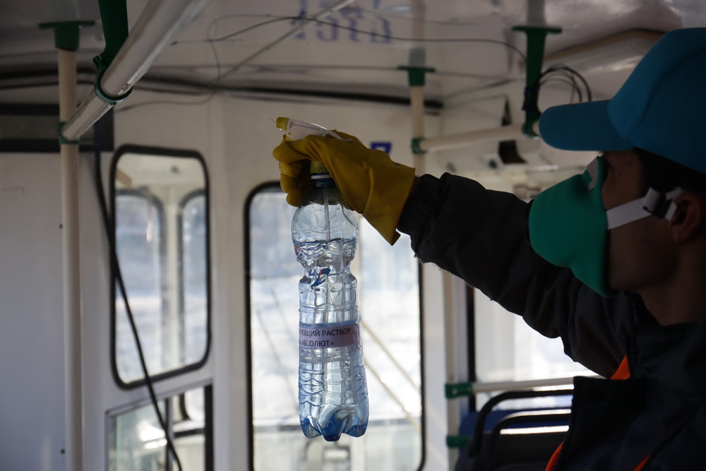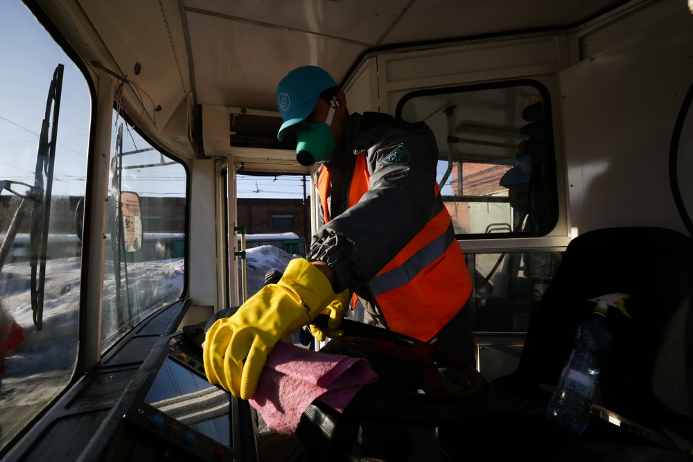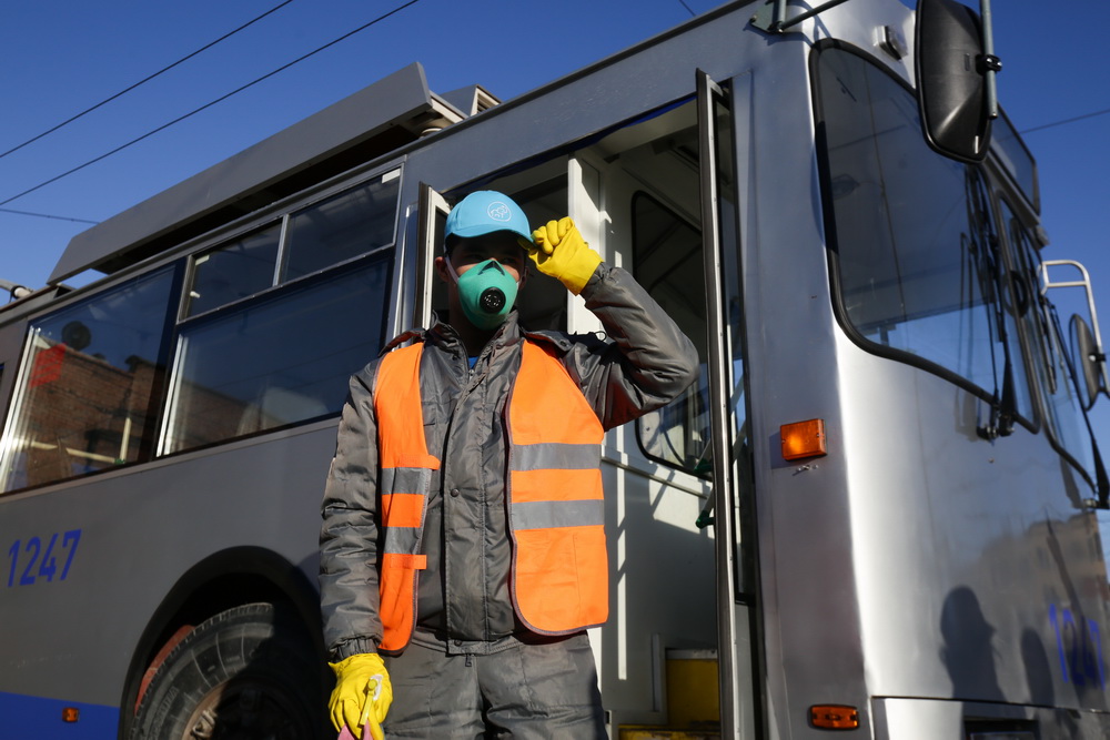 «Семь рейсов — и семь раз обрабатываем. Поручень у себя я обрабатываю, панель протираю, руль протираю у себя в кабине», — поясняет водитель троллейбуса.