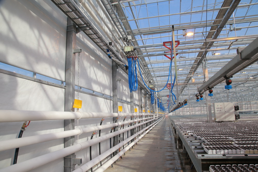 В едином пространстве теплицы — четыре климатические зоны. Подсветка, увлажнение, туманообразование, системы верхнего и нижнего подогрева создают необходимые условия. Например, в зоне рассады температура и влажность выше.