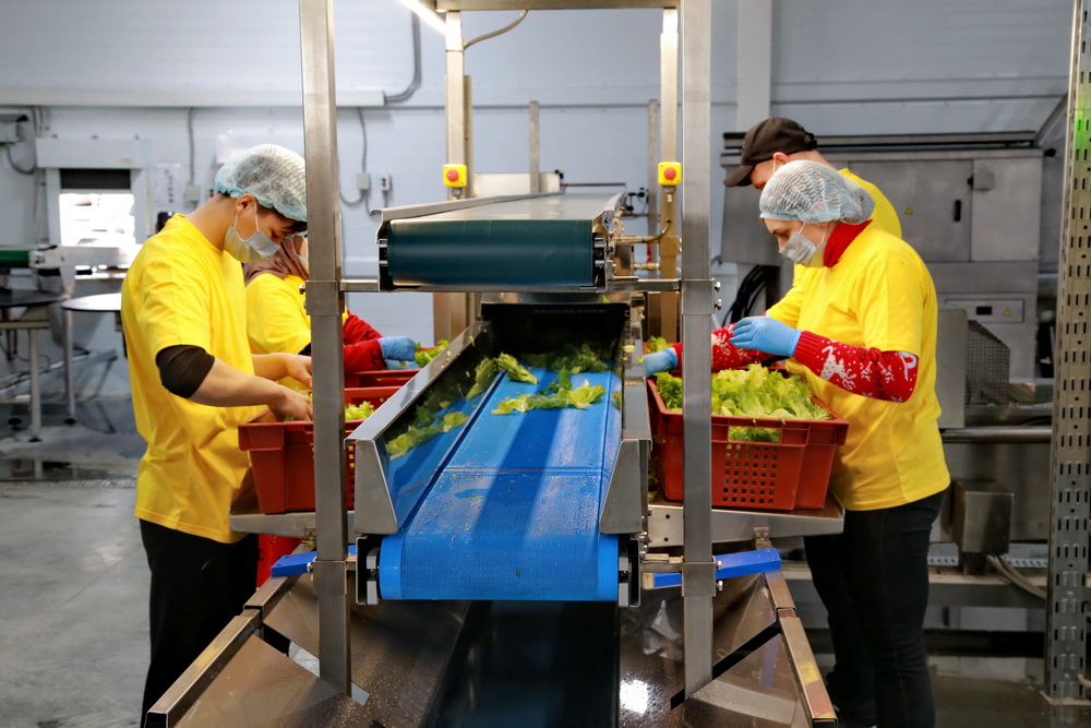 «Здесь находится салат первого дня жизни — это только-только проклюнувшееся семечко, дальше конвейер автоматически продвигает лотки в течение 28 дней — и на выходе получается готовый салат: руккола, шпинат, мангольд, самый популярный в Сибири — это, конечно же, афицион. Почему-то его народ полюбил, хотя у нас есть и красные салаты, интересные и по вкусу, и по внешнему виду», — рассказала главный агроном тепличного комплекса Ажар Бурховецкая.