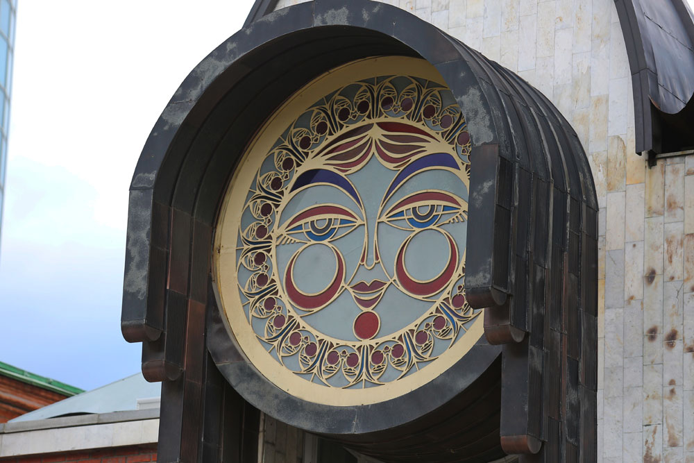 Фасад оформлен в виде трёх солнечных ликов — матрешёк из белого мрамора, витражей и металла на фоне красного отделочного кирпича. В 2018 году его немного подновили.