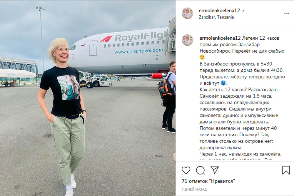 Как рассказала доктор в своём Instagram, инцидент случился неделю назад во время изнурительного 12-часового рейса Новосибирск – Занзибар. Вылет задержали на полтора часа, а спустя 40 минут после взлёта воздушное судно посадили на материк для дозаправки. Людей всё это время держали в душном салоне, дамы стали негодовать, а у одного из мужчин случился кризис.