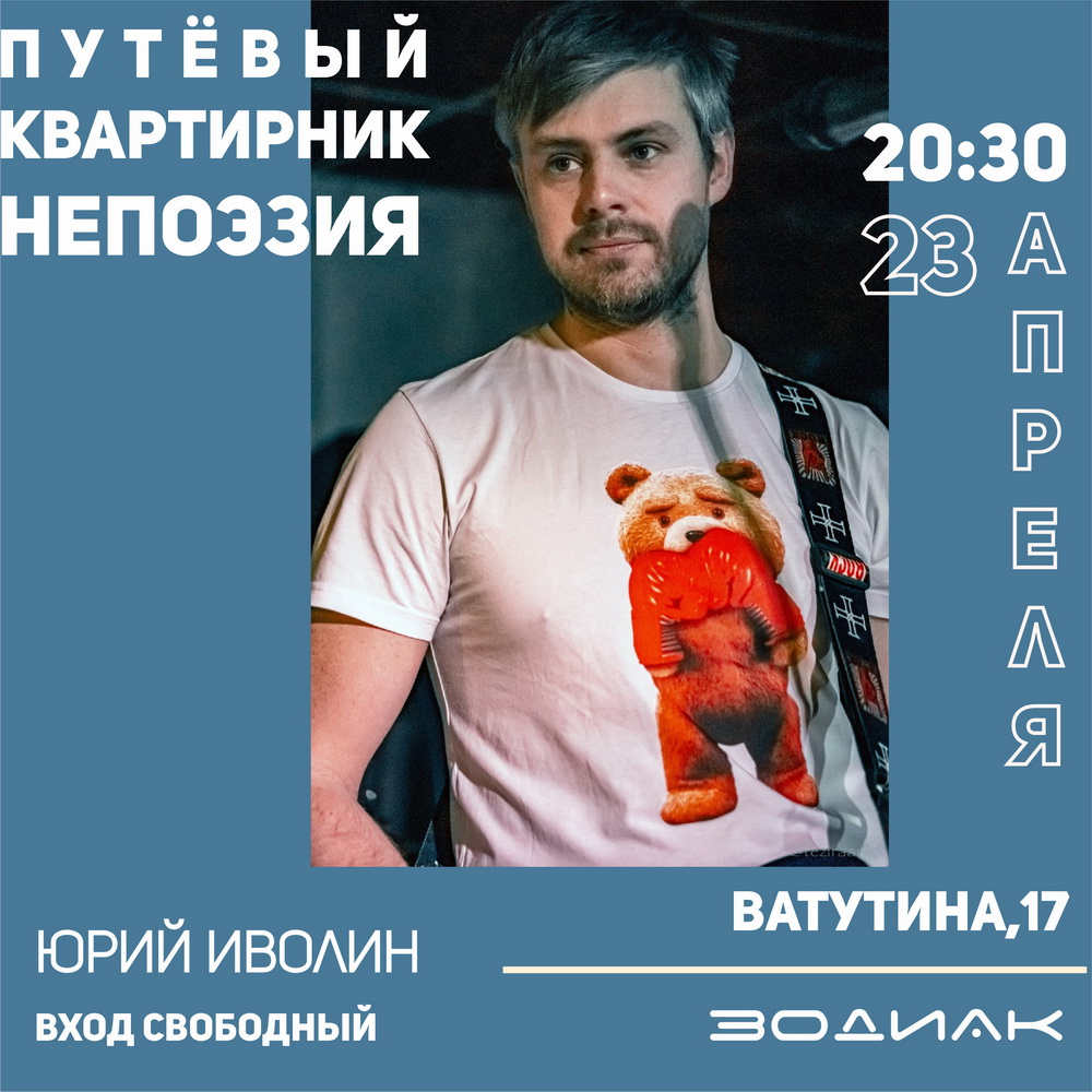 Гостем вечера станет новосибирский музыкант Юрий Иволин — меломан, вокалист-гитарист, автор текстов песен группы «НеПоэзия».