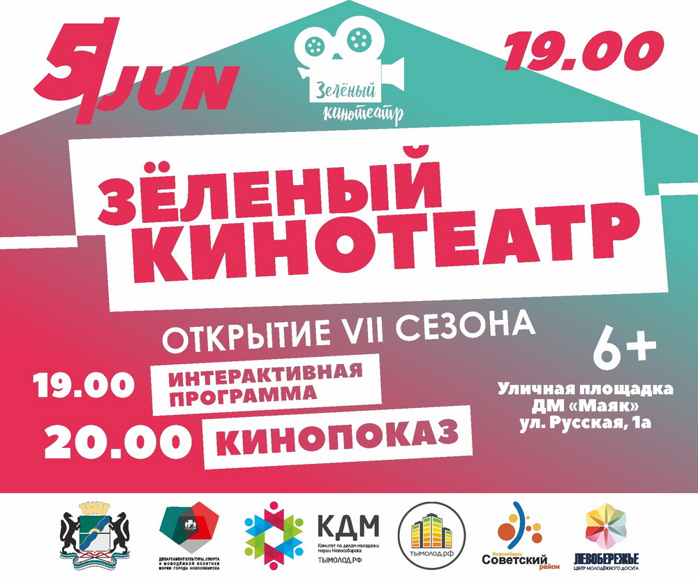 Открытие седьмого сезона «Зелёного кинотеатра» пройдёт в Советском районе 5 июня. Новосибирцы смогут смотреть фильмы под открытым небом. Пять сезонов кинотеатр работал в «Парке у Моря Обского», а сейчас «переехал» на Шлюз. Кинопоказы будут проходить в впервые три субботы месяца на уличной площадке у Дома молодёжи «Маяк» (ул. Русская, 1а).