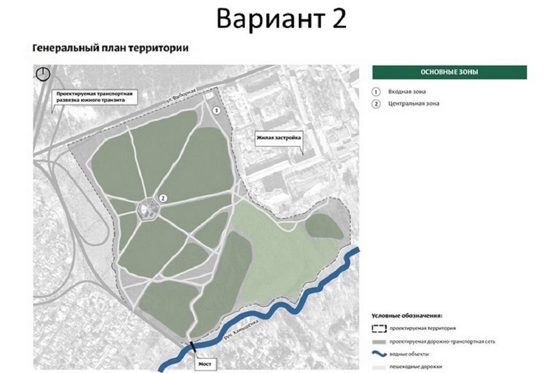 Первый вариант: проект предполагает разнообразные элементы благоустройства — детские игровые и смотровые площадки, мост через реку Камышенка, навесы для тихого отдыха, визит-центр с общественной уборной, охраной и администрацией и кафе, экотропы вдоль реки, парковку.
