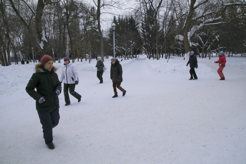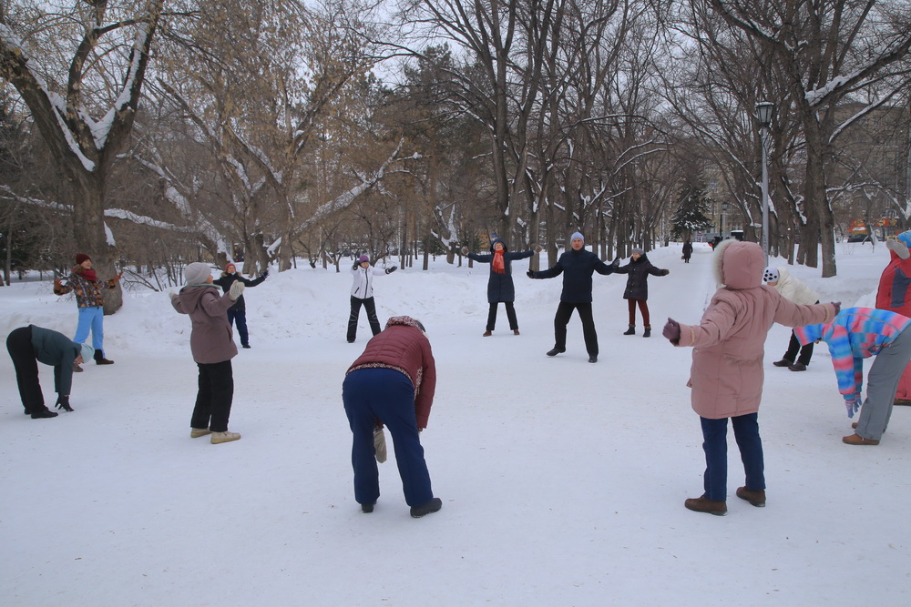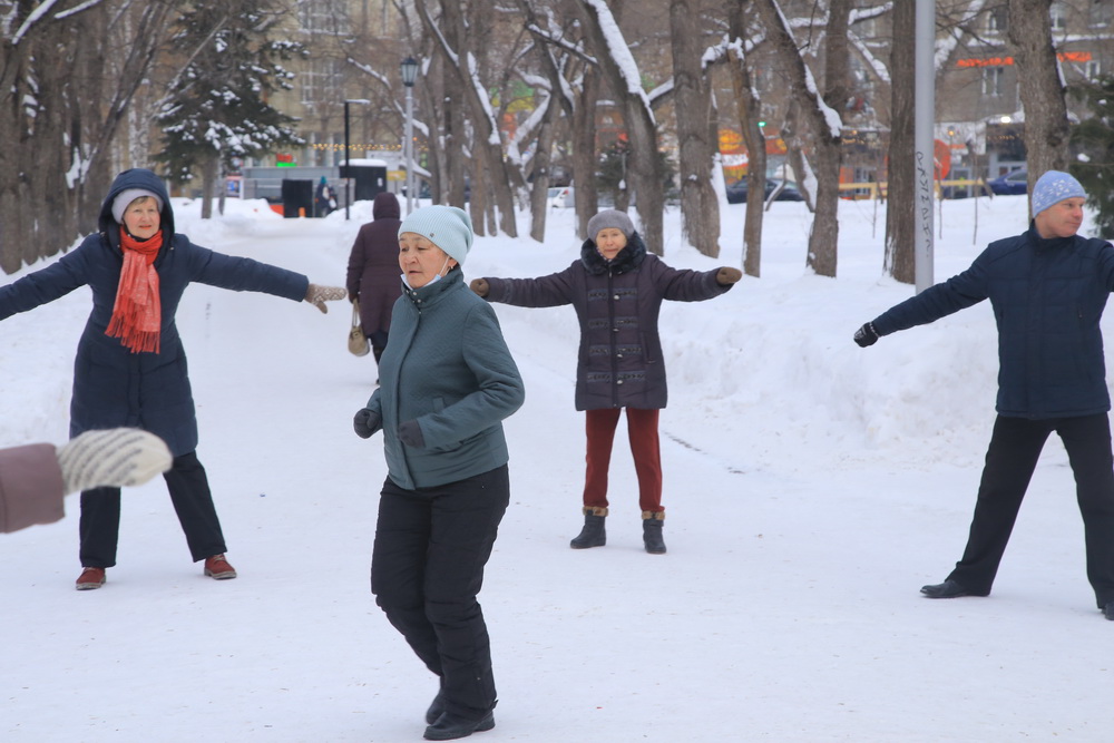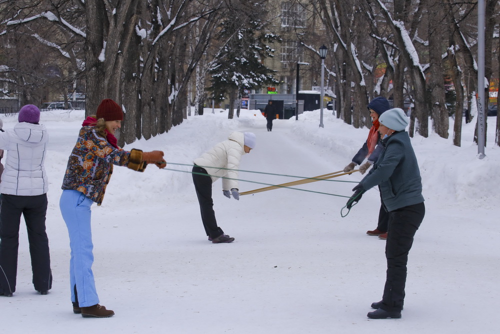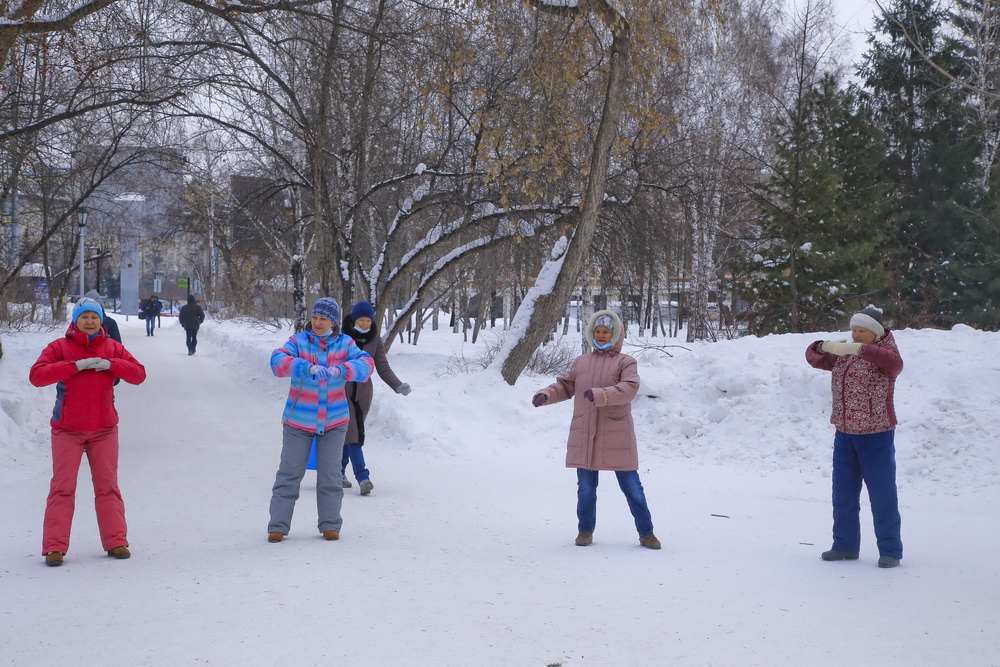 Занятия бесплатные, проходят по средам. Сезон зимней уличной гимнастики заканчивается, теперь тренировки будут проводить в спортивном зале. Но упражнения останутся прежними. Все они направлены на профилактику заболеваний позвоночника и суставов.