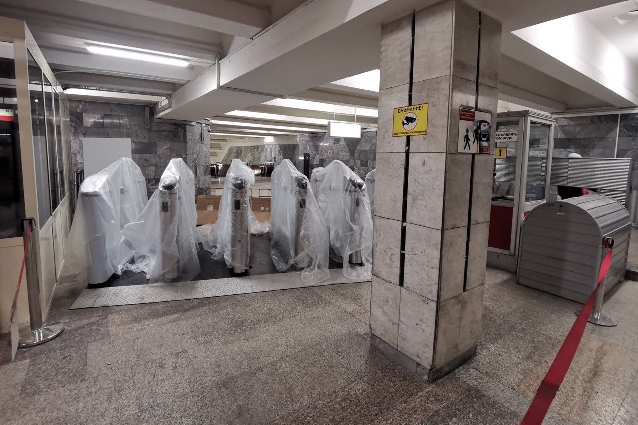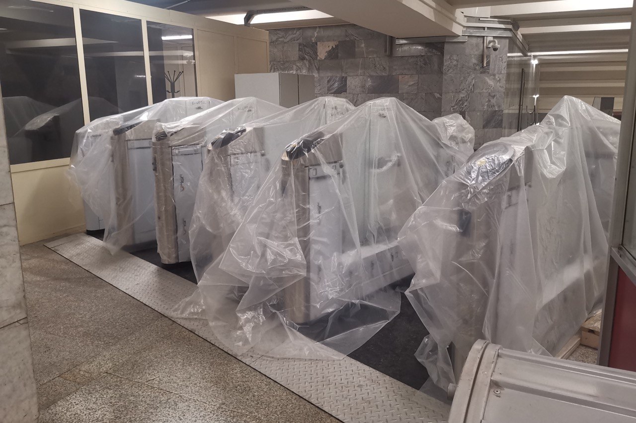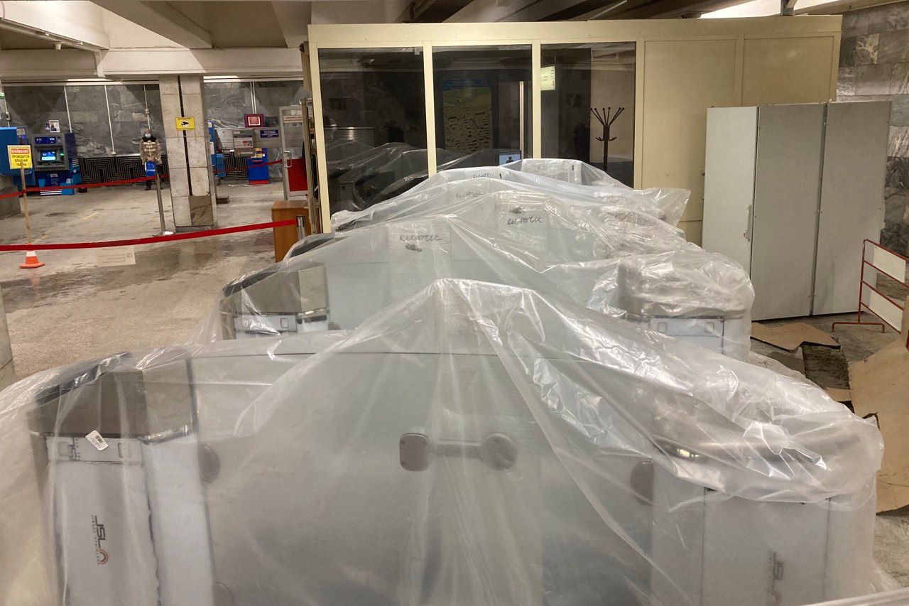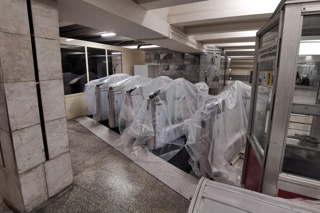 На станцию «Речной вокзал» новосибирского метрополитена привезли новые турникеты с функцией бесконтактной оплаты проезда — пока они скрыты под слоем полиэтилена.