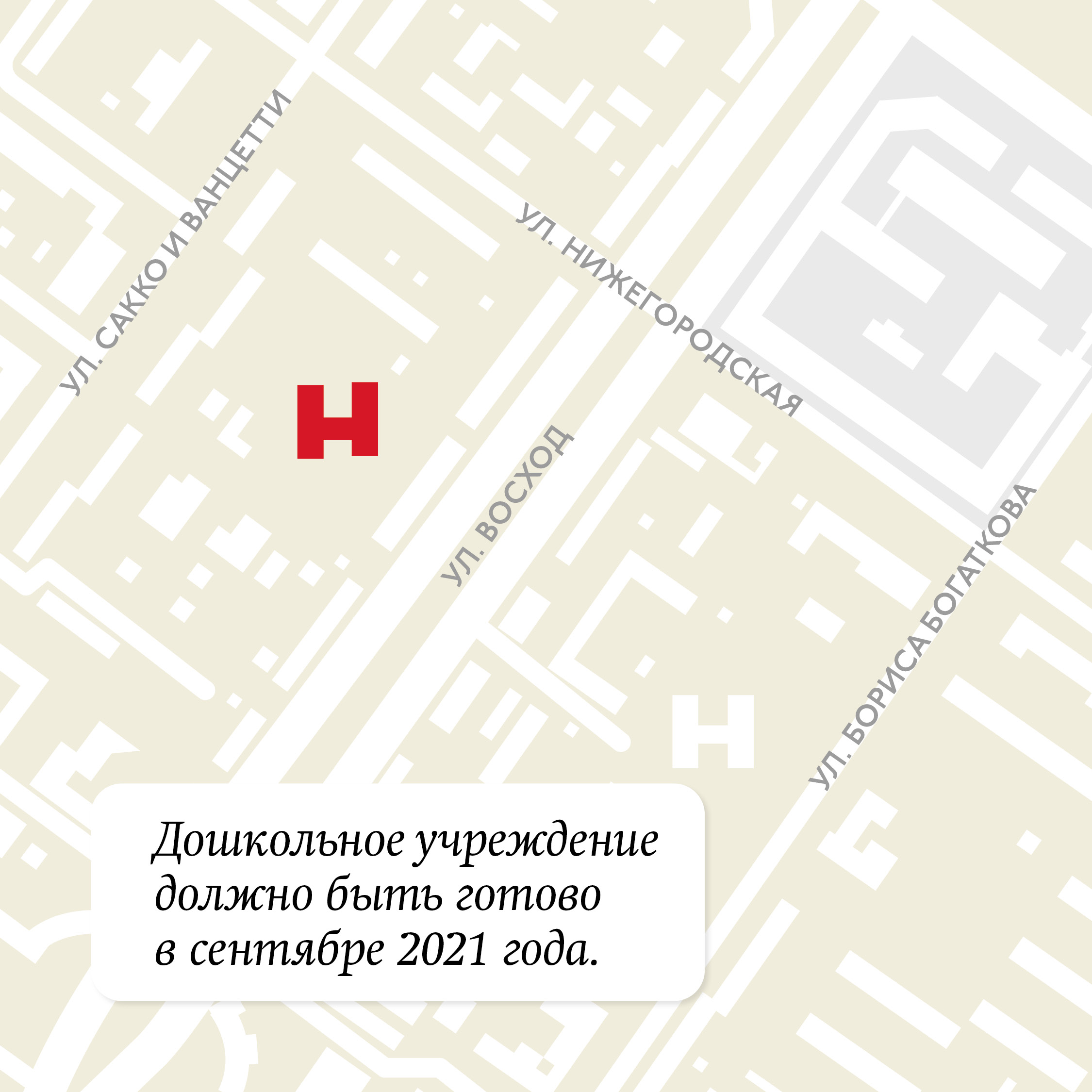 Раньше во дворах между улицами Восход и Сакко и Ванцетти был старый маленький детский сад. Теперь строят новый — просторный — по уникальному проекту. Его разработали специально, чтобы сад смог принять больше детей.