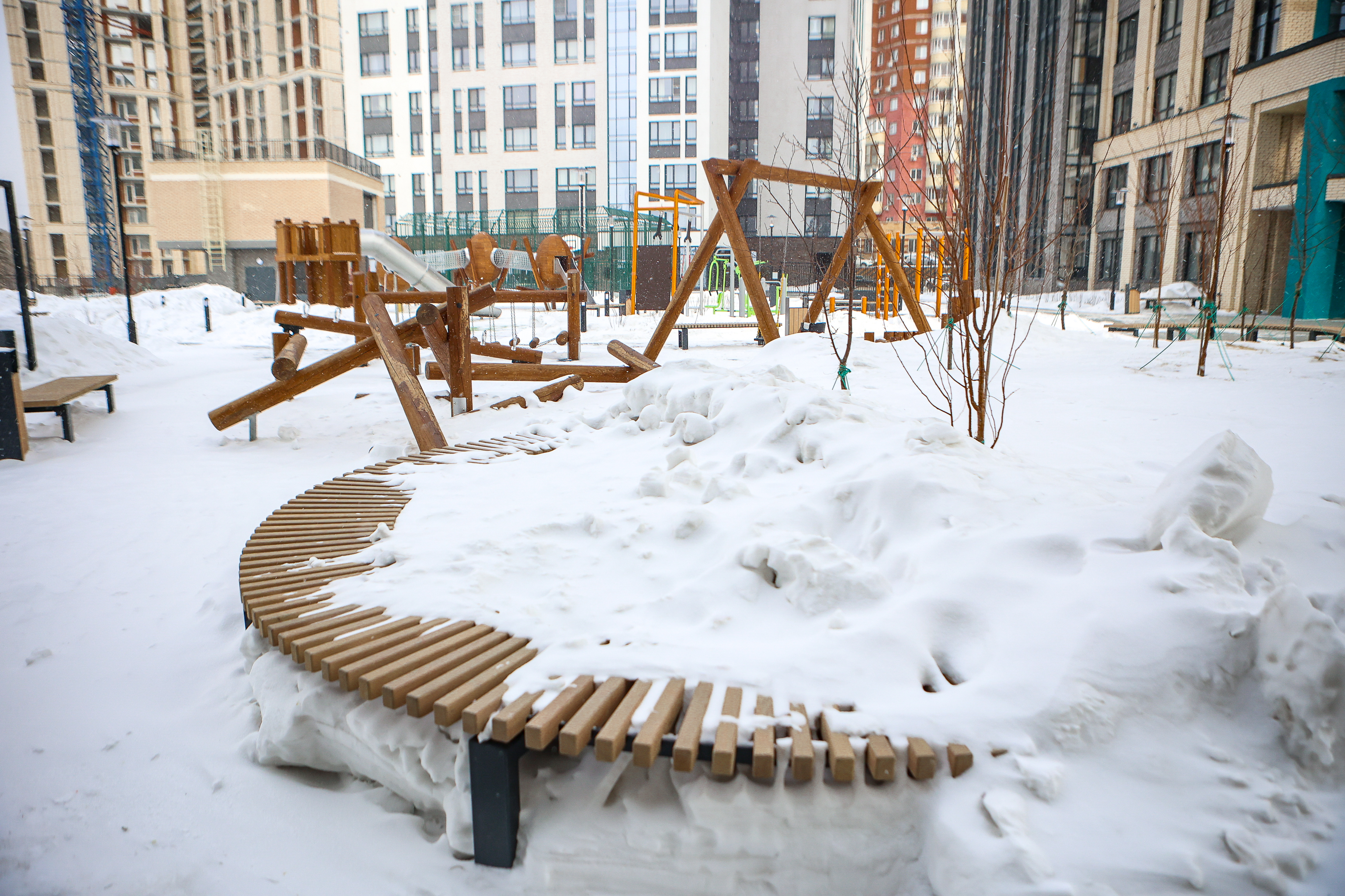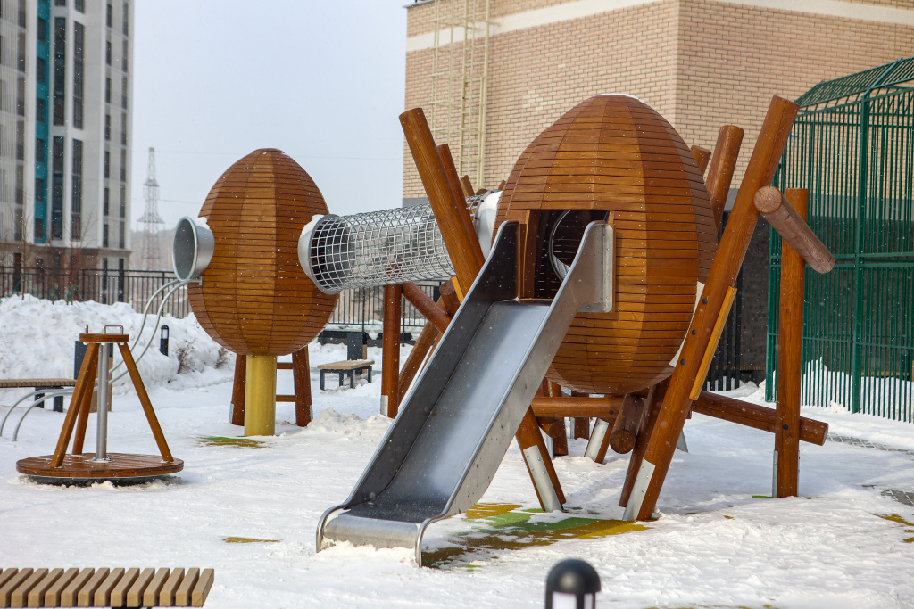Во дворе апарт-комплекса мы обнаружили сосновые шишки в человеческий рост и светильники в виде арок. Для детей там построили игровую площадку с необычными горками и качелями.