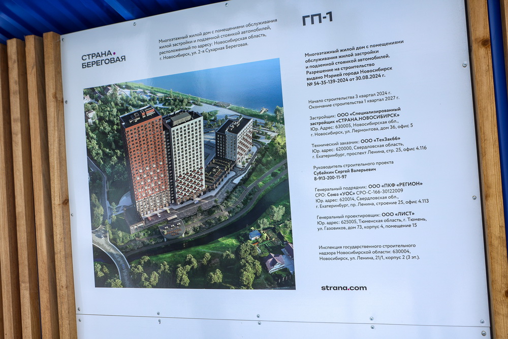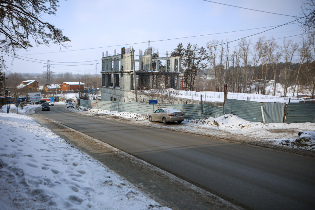 На левом берегу Ельцовки, перед мостиком, который сейчас реконструируют, находится стройка с частично возведённым зданием и сгоревшим вагончиком. Разрешение на работы получали Станислав и Вячеслав Зензины, Михаил Асадчий и Александр Дьяконов. Начали стройку в 2020 году и сдать должны были в 2021-м.