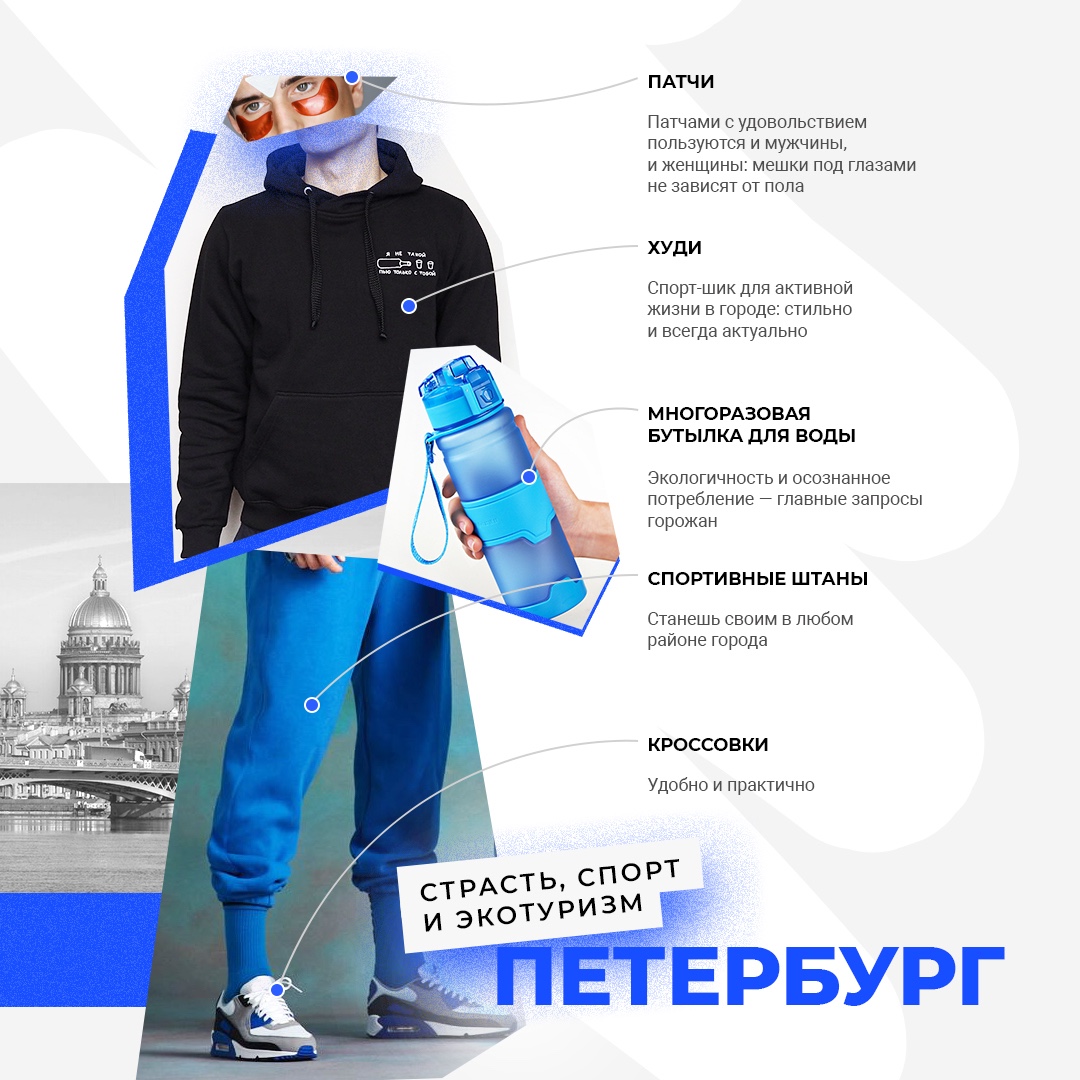 Любовью москвичей пользуются поясные сумки и худи, а летом — дождевики. В Нижнем Новогороде предпочитают винтажные вещи, а в Екатеринбурге заказывают патчи на глаза в цвет к нарядам.