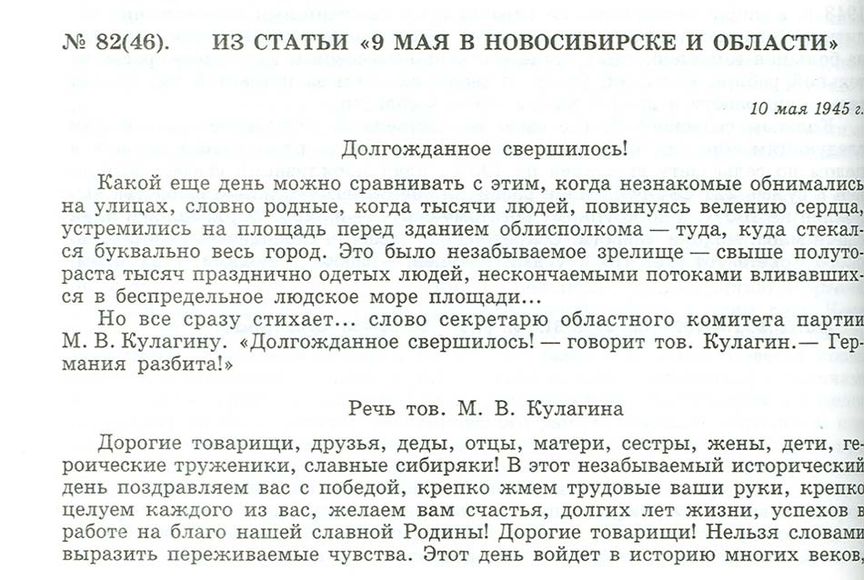 А уже в восемь утра радио зовёт: «Все на митинг!» Сотни, тысячи горожан, да что там — буквально весь Новосибирск непрерывным потоком стекается на бывшую площадь Эйхе, а ныне площадь Свердлова, перед облисполкомом. Повсюду бумажные флажки, портреты Сталина. С заводов и фабрик едут машины, нагруженные ликующим народом, прибывает народ с левобережья — со знамёнами и оркестром. Со стороны военного городка раздаются хлопки — это в небо взмывают праздничные ракеты. А на площади бушует людское море, бурлит взволнованная толпа! Люди, люди — повсюду: в окнах «дома под часами», в окнах больницы, на крышах и даже сидят на деревьях. Где-то заводят патефон, тут песню запевают. Тех, что в медалях да при погонах, качают и подбрасывают в воздух по многу раз. Но вот гул стихает: на балкон облисполкома выходит секретарь обкома ВКПб Михаил Кулагин.