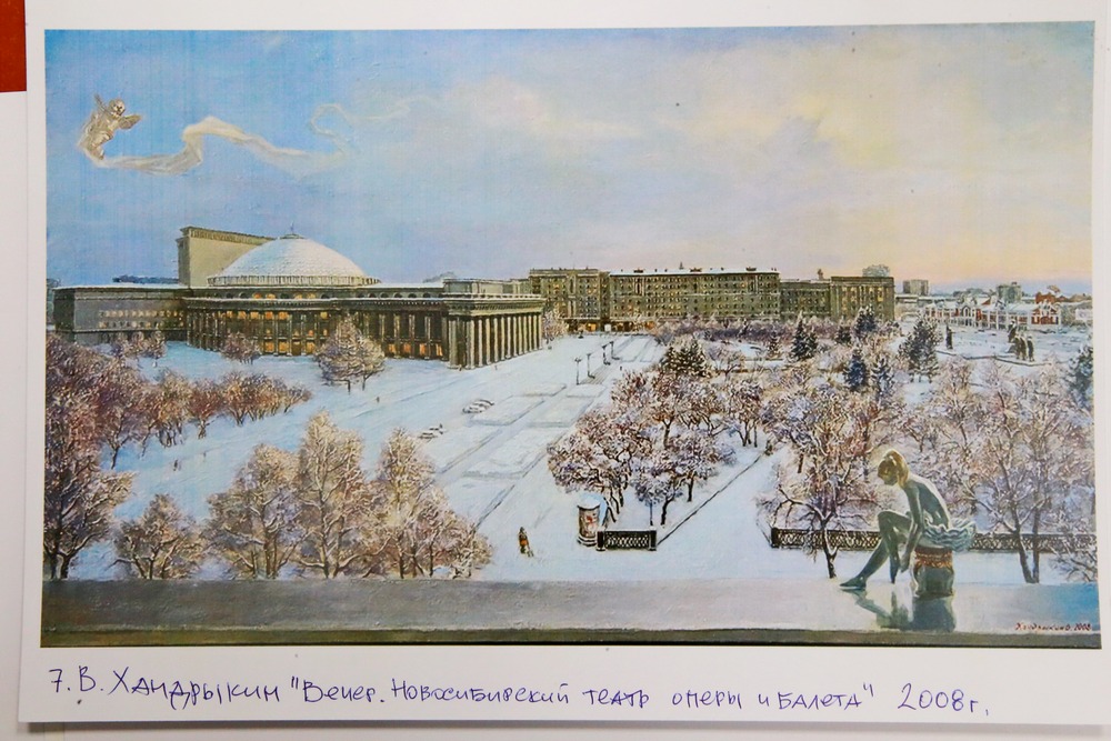 На картине Виктора Хандрыкина видно, что оперный театр — это главное здание Новосибирска, оно венчает огромную площадь, и всё подчиняется ему. Здание торгового корпуса тоже есть на этой картине, но оно очень приземлённое, вдалеке, едва заметное. Хотя при этом заметно, что оно имеет очень интересный вид, во всяком случае, выделяется.