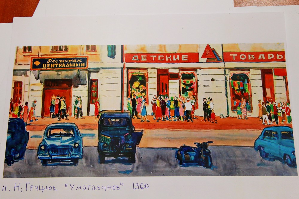 В этом жанре торговый корпус в основном изображали Михаил Казаковцев и я. Остальные рисовали его в несколько других поджанрах. Если говорить об известном художнике, нашем классике, Николае Грицюке, то он никогда не рисовал портреты зданий. Он изображал действие, некий сюжет, а как декорация к сюжету использовалось здание.