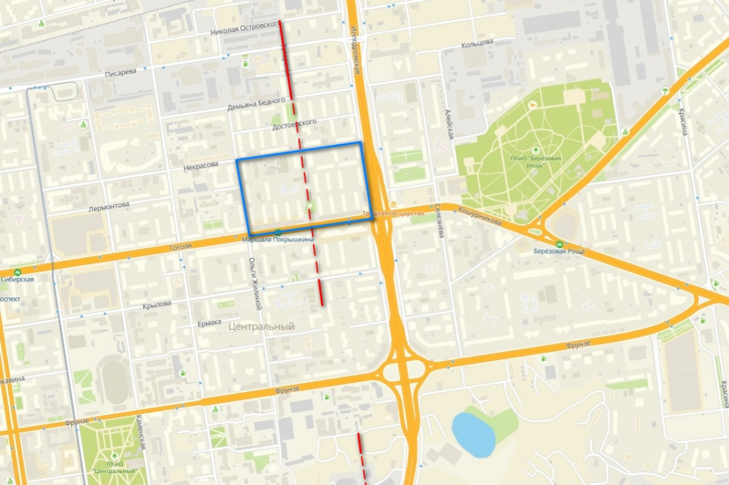 Но если соединить эти кусочки и провести между ними прямую линию, то улица как раз пересекает территорию старого — для нас, а для 1912 года нового — ипподрома, которая ограничена улицами Ипподромской, Некрасова, Гоголя и Ольги Жилиной.