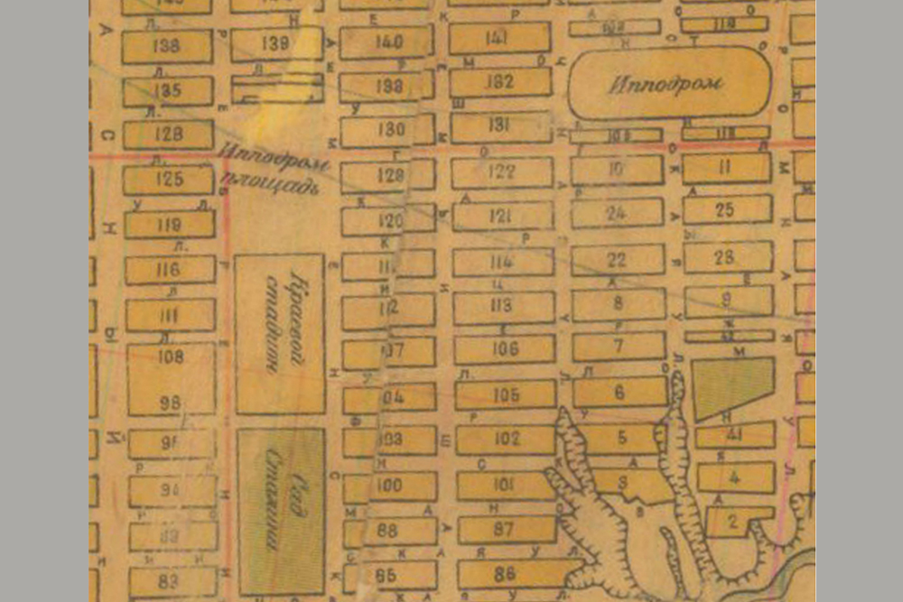 Евгений Ларин: Новый ипподром построили в 1912 году. На другом фрагменте карты, которую датируют 1935 годом, на месте Ипподромского рынка уже Ипподромская площадь. А через два квартала обозначен ипподром — между улицей Ипподромской, которая в 1935 году названа Ипподромной, и улицей Граничной, которую с 1965 году мы знаем как улицу Ольги Жилиной. Это та территория, которую мы уже обозначили.