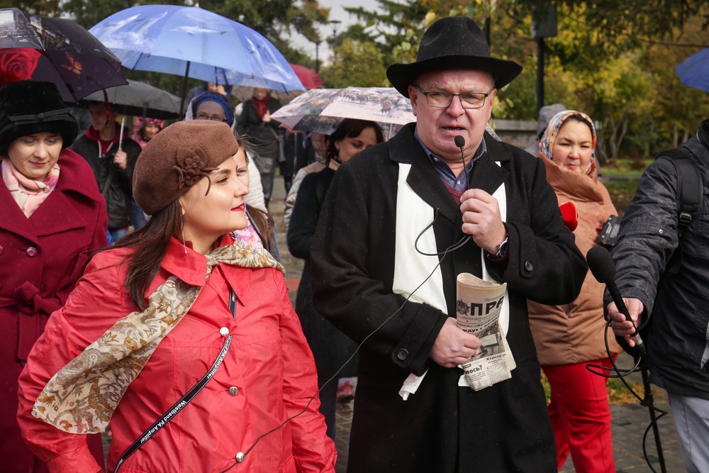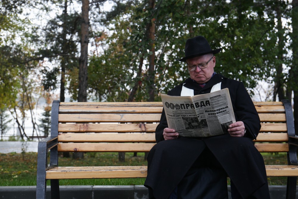 А вот сотрудник музея Игорь Минов в образе пенсионера 1970-х. В чёрном пальто, в белом шарфе и шляпе он читает «Правду» на скамейке. Пенсионеры 1970-х помнят, что до начала строительства моста на набережной было две водно-лыжных станции.