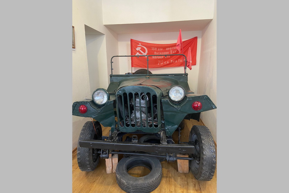 Татьяна Голубченко: В экспозиции нашего музея представлен легендарный трудяга, автомобиль-фронтовик, участник боёв Великой Отечественной войны — ГАЗ-67. Его нашли в Воронежской области. Восстановил автомобиль и передал нашему музею на временное хранение Алексей Витальевич Симушин. Машина на ходу, она сама приехала к нам в музей, сейчас можно посмотреть, как она выглядит. Это представитель командирских машин. Это мог быть и автомобиль-разведчик, он мог перевозить солдат-пехотинцев, возможно, раненых.