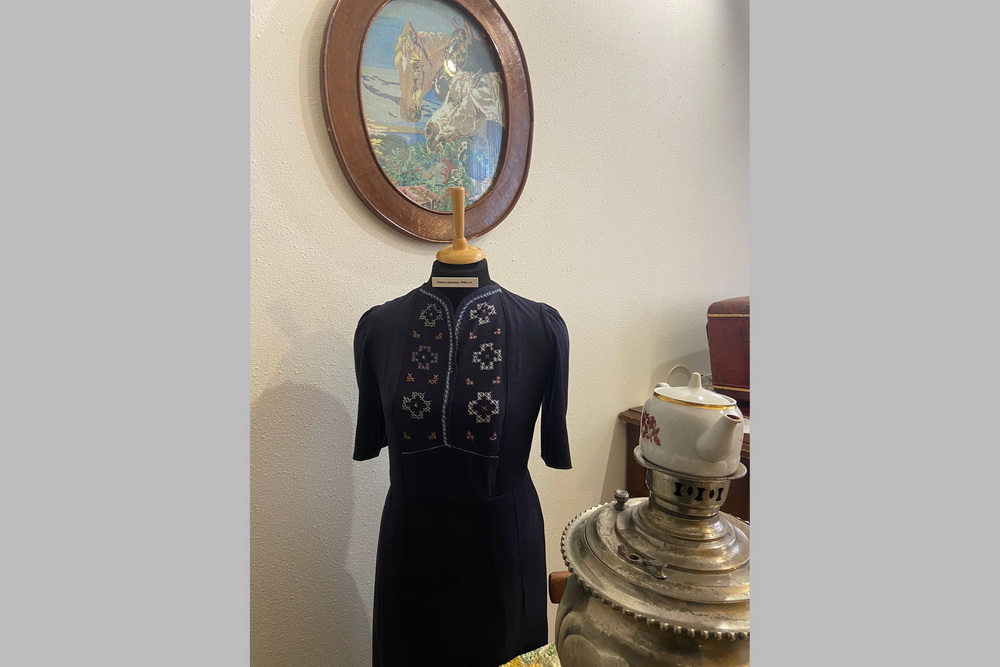 И ещё не могу не рассказать о замечательном платье, которое у нас находится в комнате 1950-х годов. Это синенькое платьице, очень скромное, красивое, с вышивкой. К нам в музей оно тоже попало интересным образом.