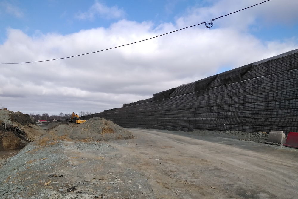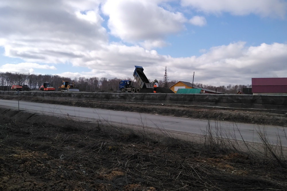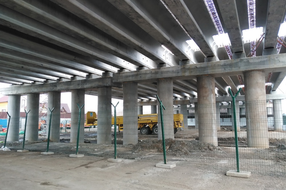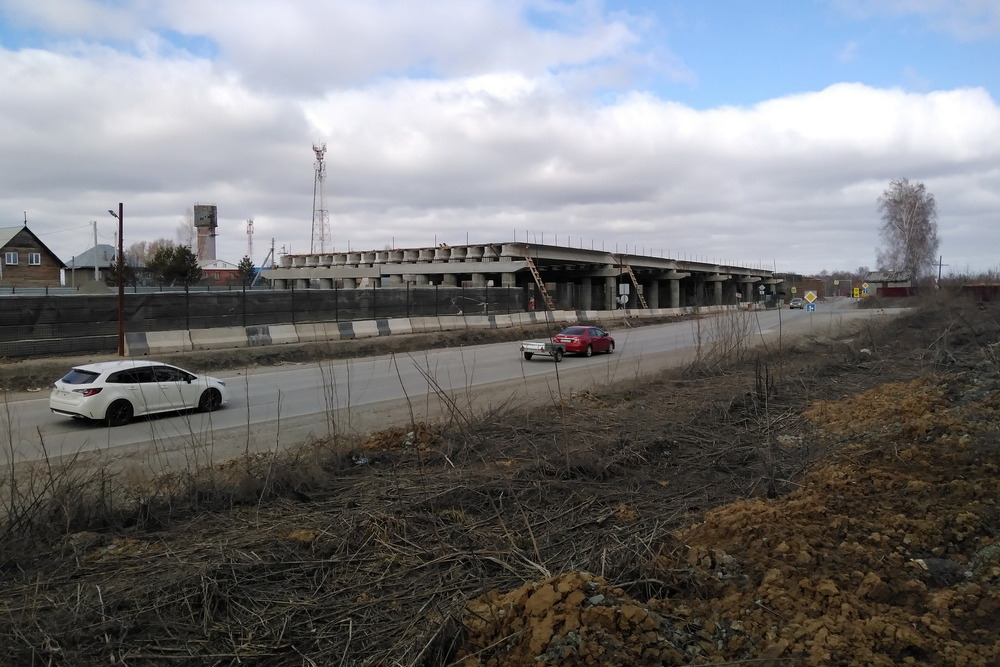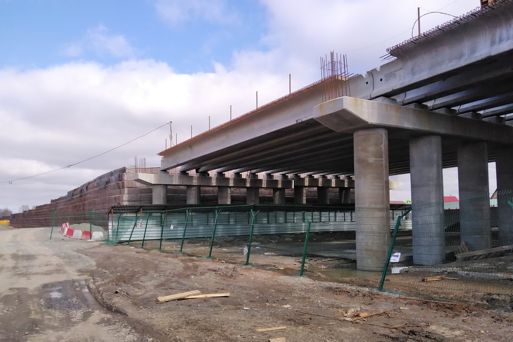 Сейчас выполнен огромный объём работ: установлены опоры эстакады, на них смонтированы пролётные балки, со стороны города сделана насыпь съезда на дорогу. Идёт обустройство спуска с восточной стороны, рельеф уплотняет тяжёлый дорожный каток. На площадке также работают экскаваторы, бульдозеры, самосвалы.