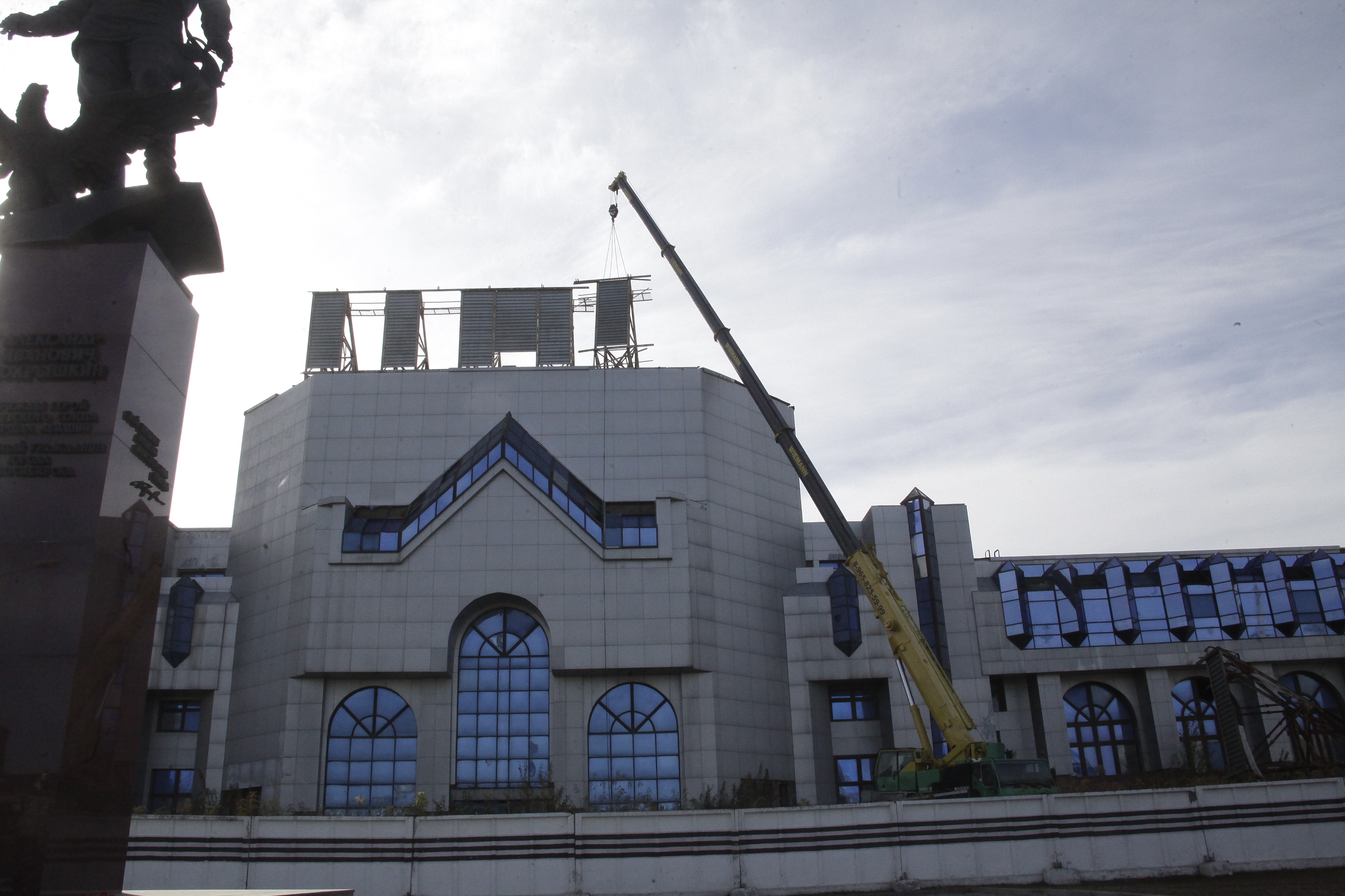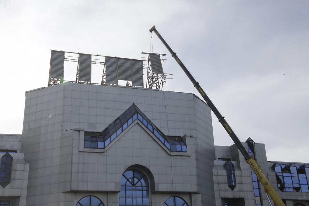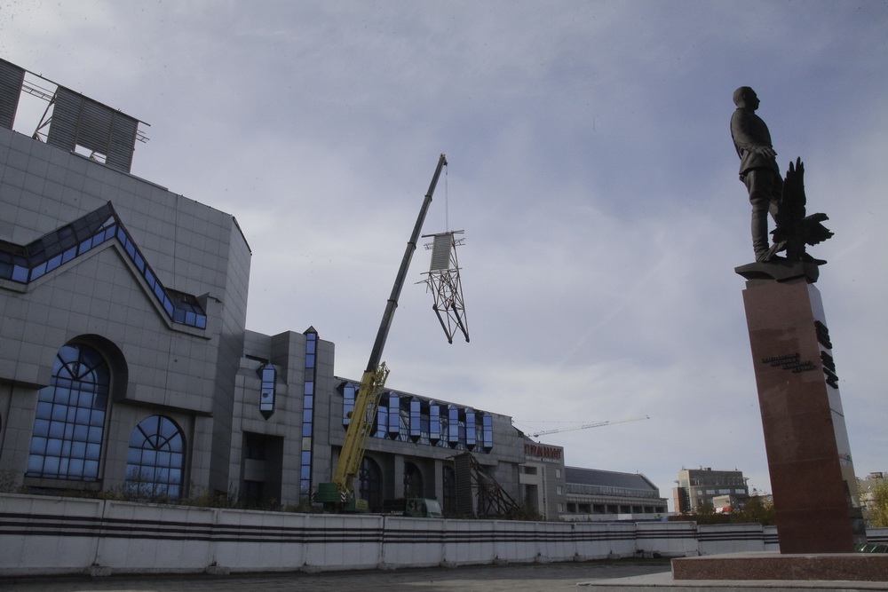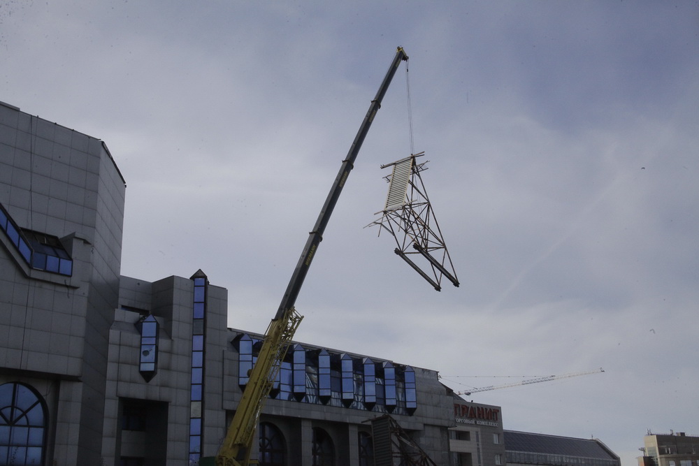 В Новосибирске с крыши главного долгостроя площади Маркса — ДК «Сибсельмаш» — с помощью автокрана демонтируют большую рекламную конструкцию.