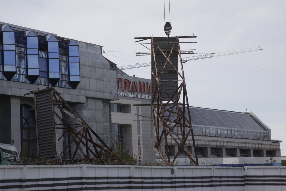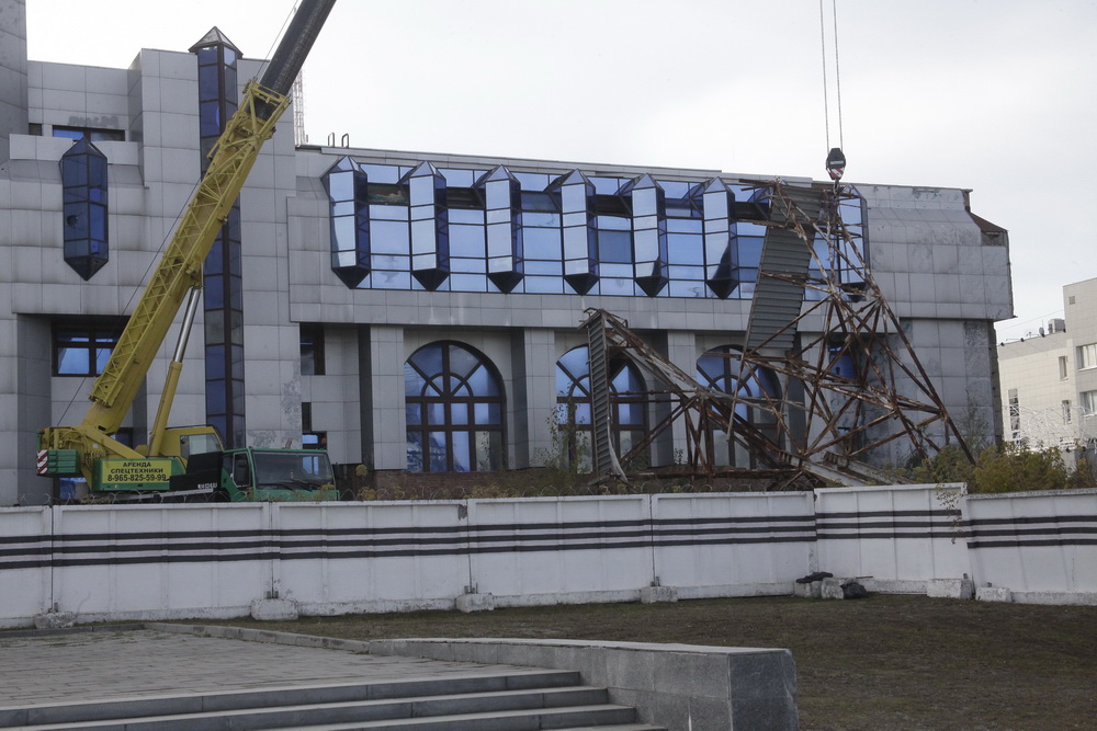 Готовиться к демонтажу рабочие начали ещё на прошлой неделе, а сегодня, 12 октября, на территорию долгостроя заехал автокран, с помощью которого на землю опустили огромные металлические детали. На крыше они не кажутся такими массивными, но вблизи поражают размерами.