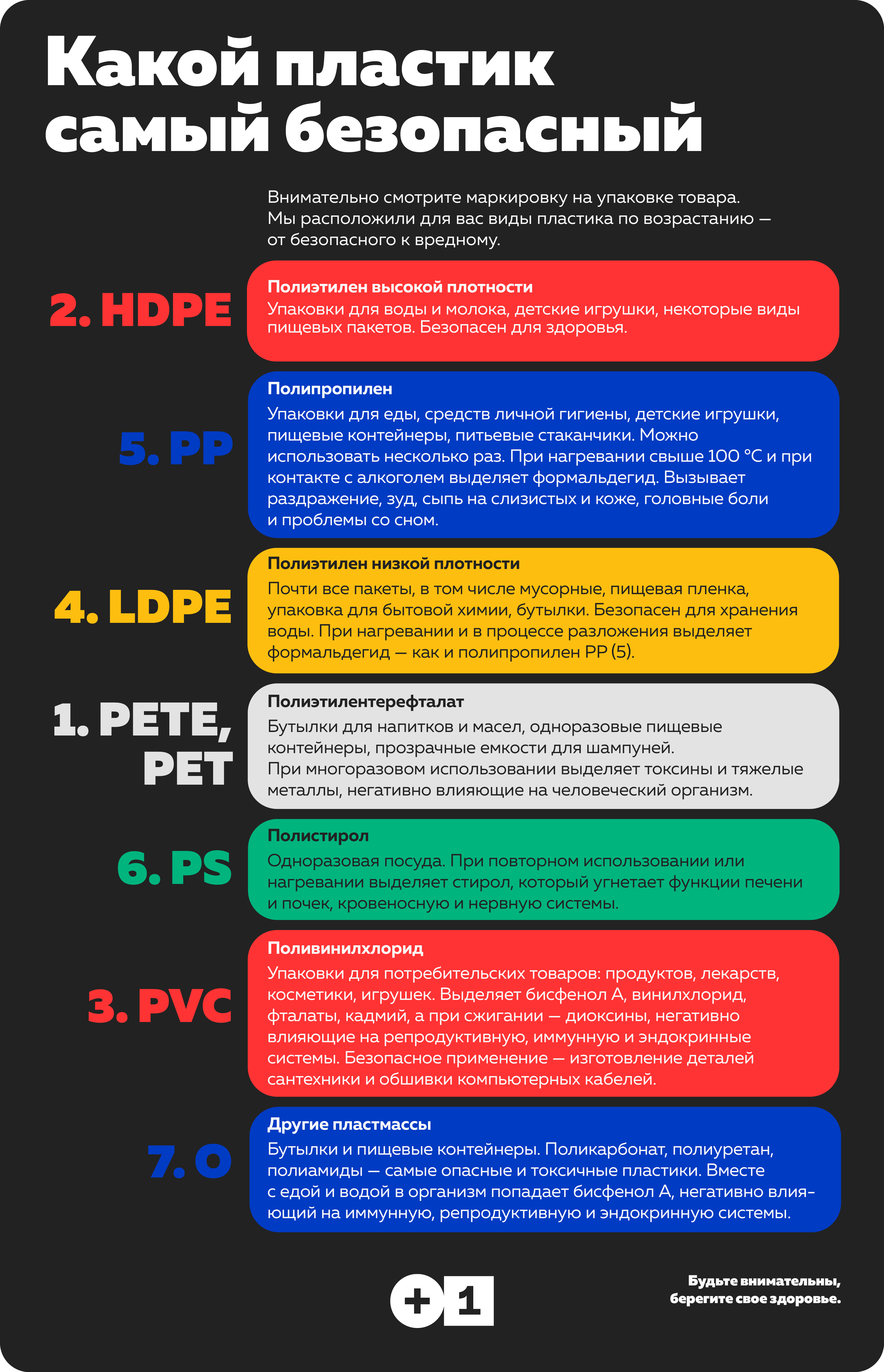 Не применяйте повторно ПЭТ-бутылки, используйте для хранения продуктов пластики, отмеченные цифрами 2 (HDPE) и 5 (PP). Пластик других категорий отдавайте на переработку.