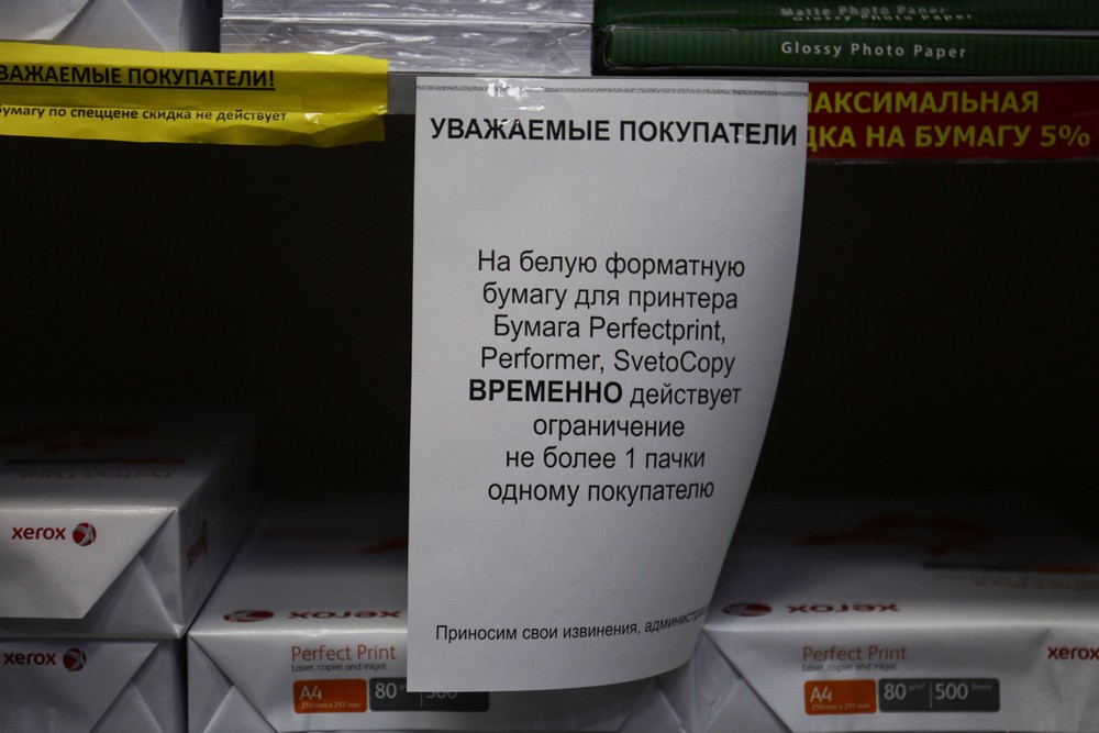 Нехватки бумаги не ожидается. К тому же в магазины скоро поступит крупная партия дефицитного товара от российского производителя. Поэтому новосибирцам рекомендуют не создавать ажиотаж: повышенный спрос стимулирует подорожание. О случаях существенного завышения цен просят сообщать в антимонопольную службу.