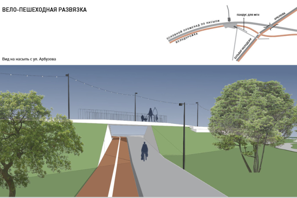 Вело-пешеходную дорожку хотят закольцевать, а некрасивый металлический забор отдать граффитистам. Также предусмотрены детская площадка в экостиле (на поляне у ручья), компактные кофейни, места для выгула собак, длинные стенды с историей территории, зоны для настольных игр и воркаута.