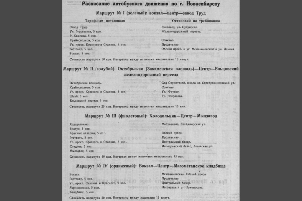 Зелёный автобус маршрута №1 курсировал от вокзала через центр до завода «Труд». Маршрут №2 голубого автобуса пролегал от Октябрьской (Закаменской) площади до Ельцовской, то есть современного Бурлинского железнодорожного переезда. На фиолетовом автобусе №3 можно было доехать от Холодильника (это в районе ДК Кирова) через центр до Мылзавода (это Новосибирский жировой комбинат на ул. Семьи Шамшиных, 94). И, наконец, оранжевый автобус ходил по маршруту №4 от вокзала с остановкой в центре и до мусульманского кладбища, что находилось в районе Берёзовой рощи.