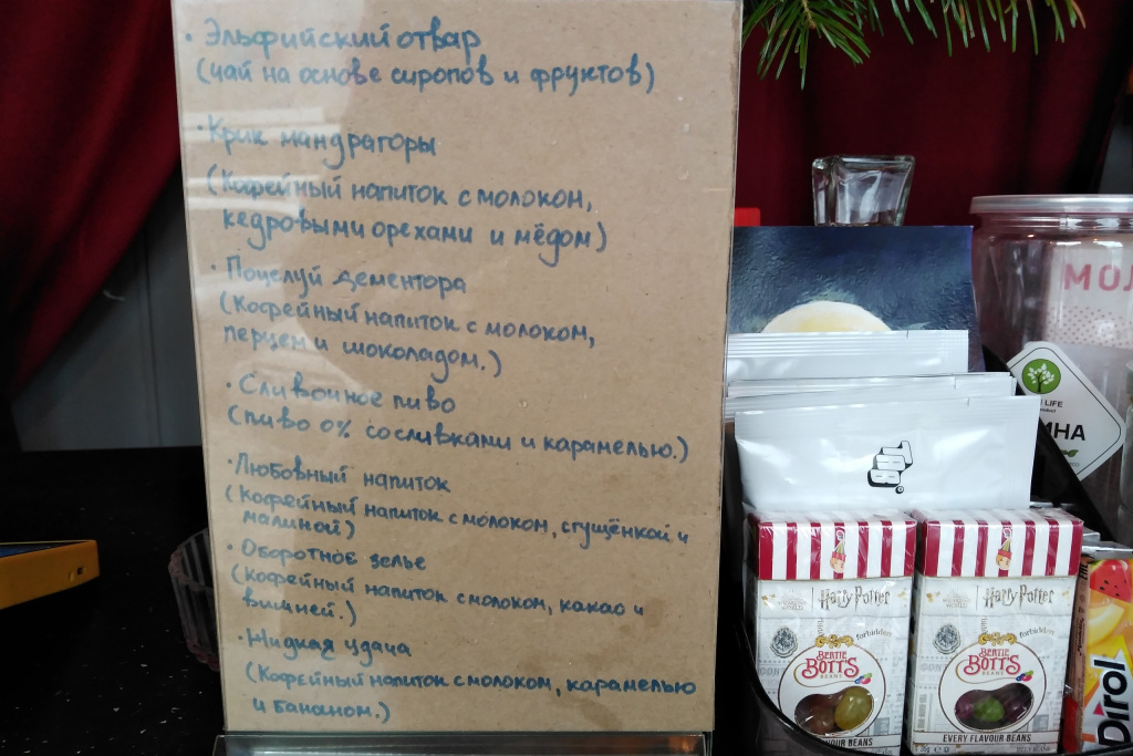 Это одна из самых атмосферных кофеен Новосибирска, наполненная атрибутами Вселенной Гарри Поттера. Открылась минувшим летом. В магическом меню: безалкогольное сливочное пиво, эльфийский отвар, кофейные напитки «Поцелуй дементора» с перцем, «Крик мандрагоры» с кедровыми орешками, «Оборотное зелье» с вишней и «Жидкая удача» с бананом.