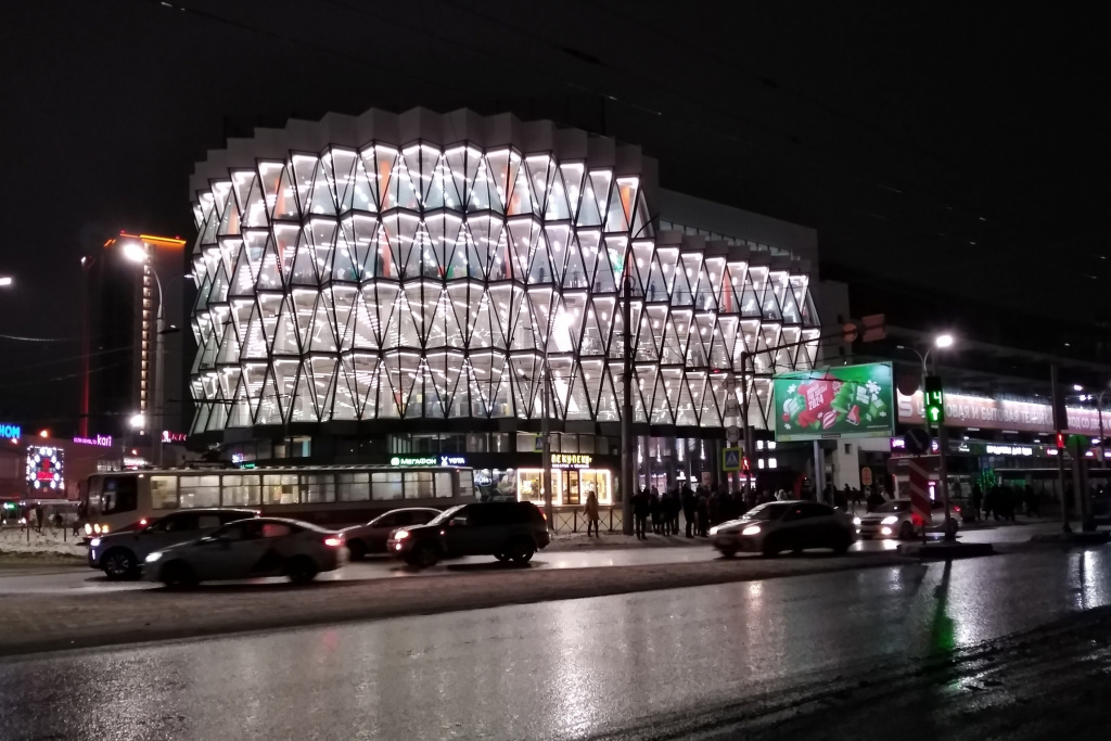 Ко Дню города на площади Маркса открыли один из самых необычных торговых центров Новосибирска — ТЦ «Грани». Он имеет футуристический ребристый фасад и эффектную подсветку. У здания пять этажей, общая площадь — около 16 000 кв. метров. Большая часть помещений уже нашла своих арендаторов. Летом над перехватывающей парковкой планировали организовать фуд-корт на 10 000 кв. метров, но сделать этого пока так и не удалось.