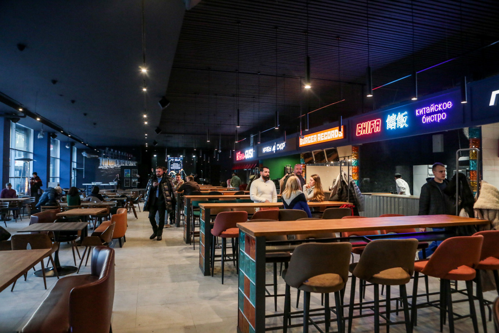 Это в том числе пиццерия, три точки с азиатской кухней, бургерная, рёберная, пельменная, Bubble tea bar, крабовая, кофейня и кондитерская. Для гостей предусмотрели два зала на 300 с лишним мест. Торговую зону в «Универсаме» оставили, но её площадь сократили.
