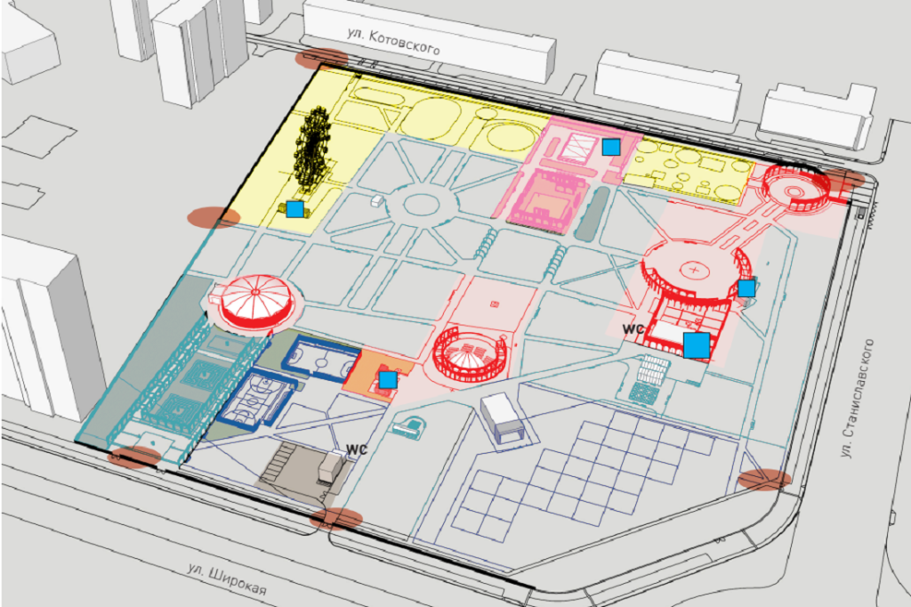 Также общественное пространство украсят ротонда, фонтан, солнечные часы, экстрим-парк, спортивная и детская площадки, поле для мини-футбола, беговой маршрут, колесо обозрения и пруд. А на входе в парк установят семиметровую аркаду-трельяж, подобную высоким воротам, выполненным в 1970-х годах.