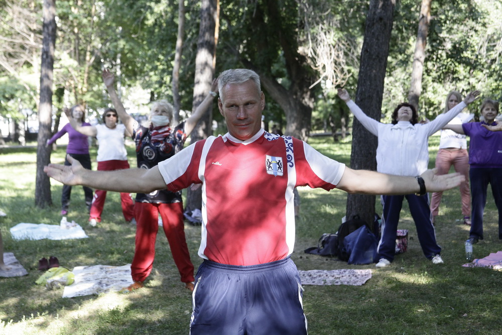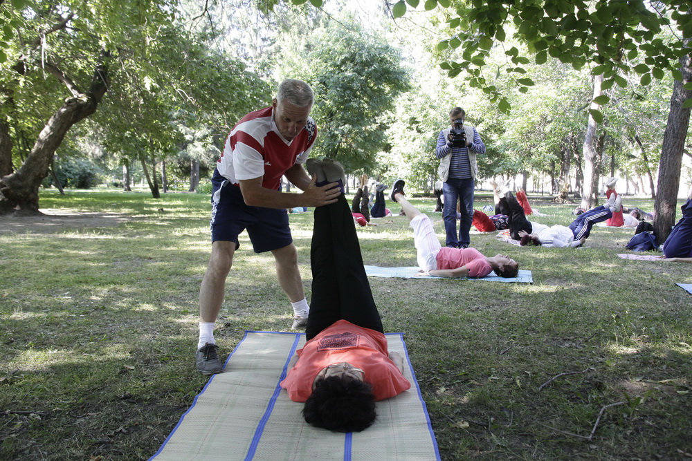 Тренировку проводит Владимир Ефремов. Он сам разработал методику для профилактики болезней позвоночника и суставов. Сегодня спортсмены-любители укрепляют мышечный корсет и изучают технику правильного дыхания.