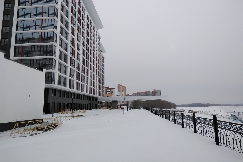 На правом берегу Оби готовят к сдаче двухсекционный комплекс апартаментов ApartRiver. Он расположен на первой линии — буквально в 30 метрах от воды. Из арки между корпусами к реке ведёт «парящий мост» длиной больше 60 метров. Он будет выполнять функцию смотровой площадки, возвышаясь над променадом.