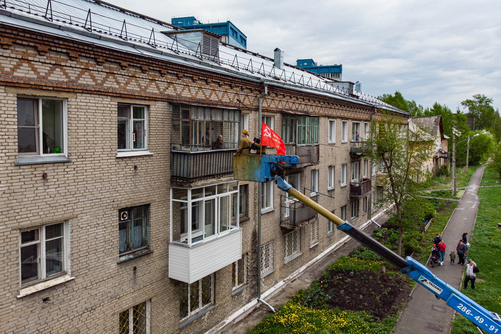 В Первомайском районе ветераны Великой Отечественной войны тоже начали принимать поздравления. Здесь активисты нашли необычный способ соблюсти социальную дистанцию и ограничить личное общение с пожилыми людьми. Артистов поднимают на автовышке к окнам и балконам фронтовиков и тружеников тыла.