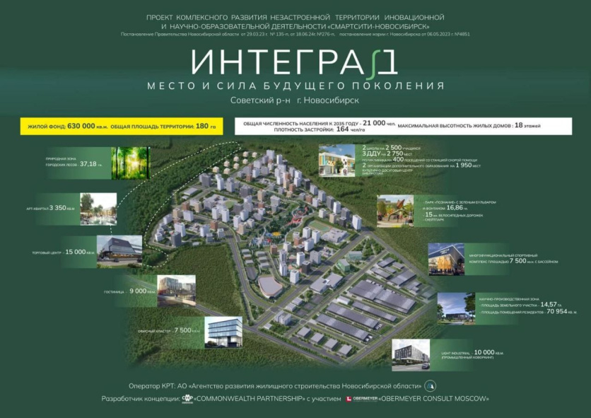 Это одна из крупнейших концепций комплексного развития территорий в регионе, известная ранее как «СмартСити-Новосибирск». Строительство планируют начать в 2026 году. До 2035 года общий объём государственных и частных инвестиций в проект превысит 150 млрд рублей.